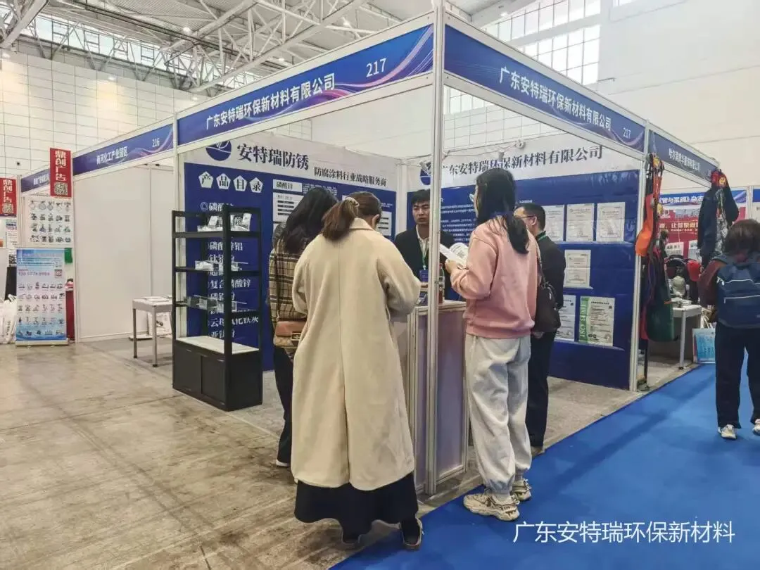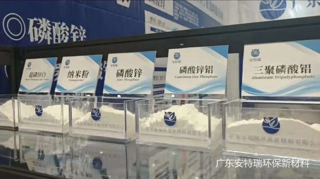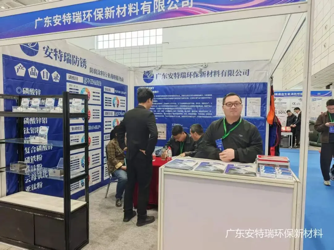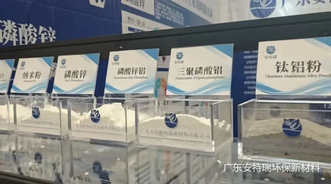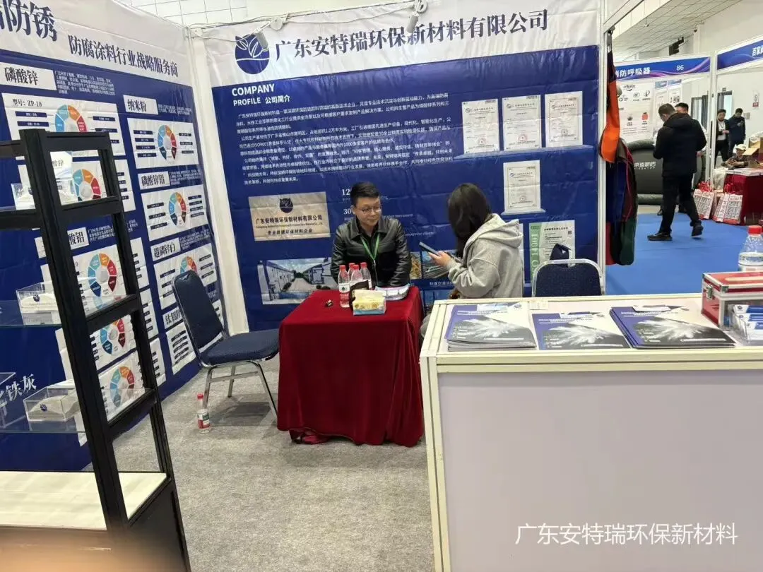 展会期间,安特瑞展位人气持续高涨。简约大气的展台设计、专业细致的团队讲解,吸引了众多国内外客商驻足交流。以防锈颜料与性能填料为核心,我们精准匹配行业需求,重点展示了覆盖多场景应用的核心产品矩阵,包括:磷酸锌、三聚磷酸铝、纳米粉、钛铝粉等系列产品,全面满足不同客户对环保防腐性能的多元需求。