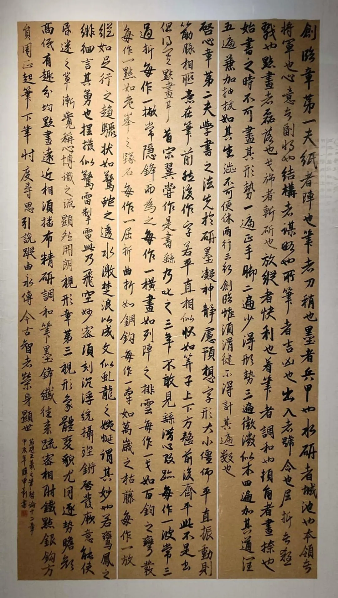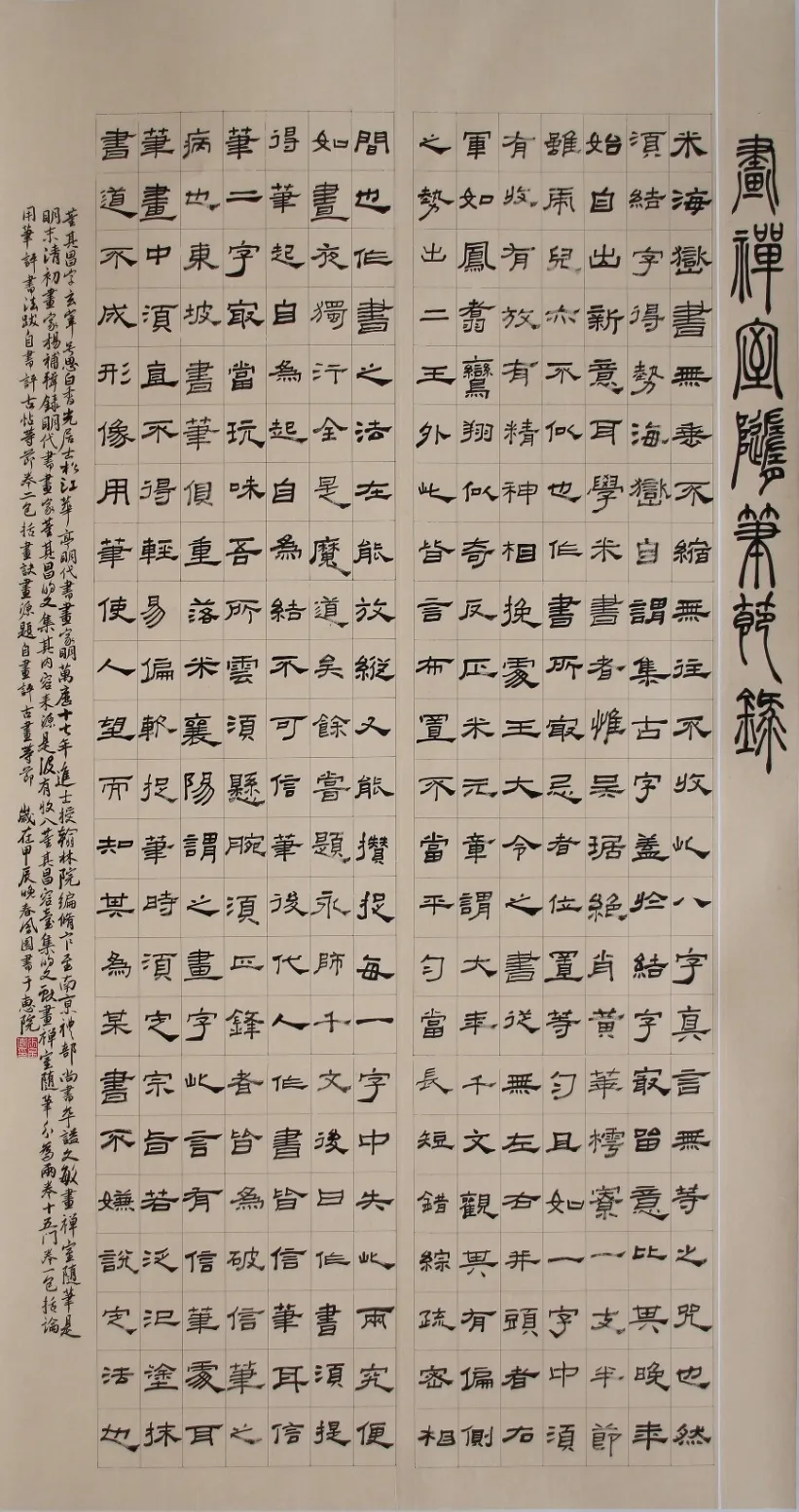 作品简析: 此作品内容为董其昌《画禅室随笔》卷一中关于论用笔的部分,作品主要取法汉隶《礼器碑》,同时融入了其他隶书的特点,强调了书写的艺术性,以两条屏为章法布局。右侧题签取法吴让之,左侧以三列跋文和落款的形式呈现。整体布局精心设计,使得跋文和题签丰富了作品的形式,但并未喧宾夺主,保持了整体的和谐统一。