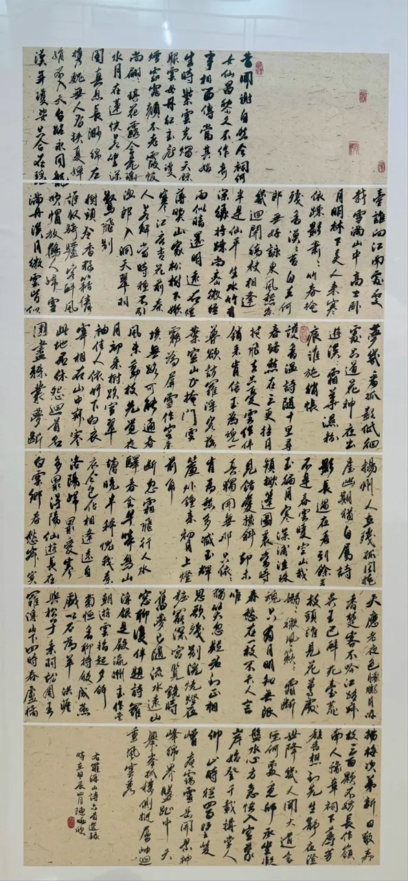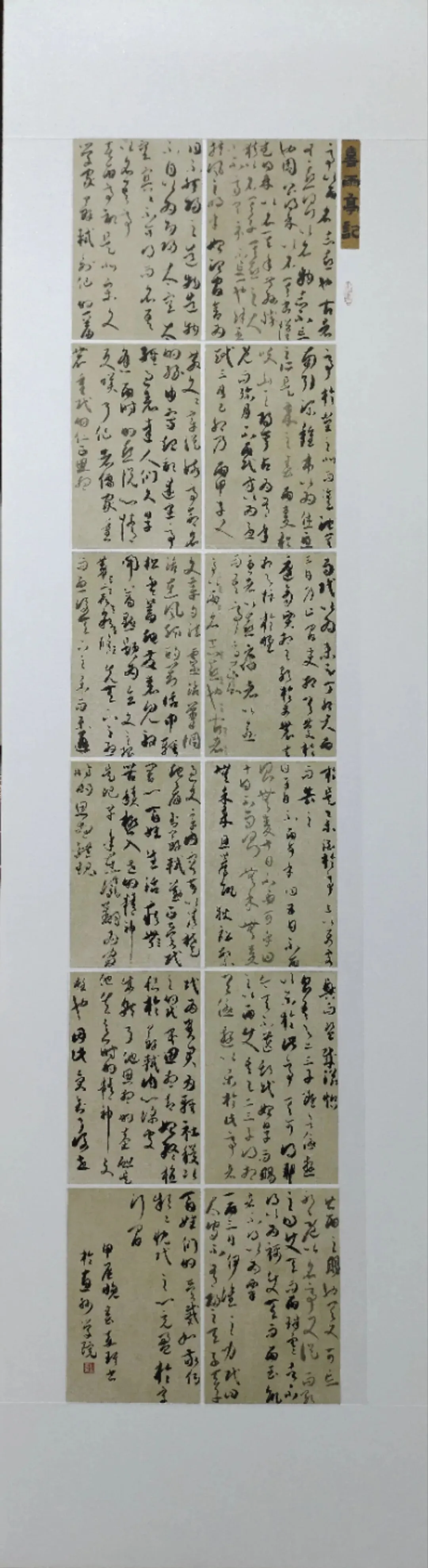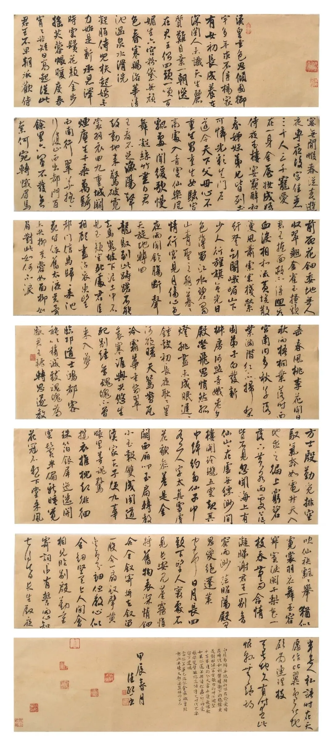作品介绍:作品以白居易的《长恨歌》为内容,它超越单纯的文词之美的地方,恰到好处的把美好的爱情抒发出来。作品主要以米芾笔意有意识增加节奏的变化前密后疏,加强字组之间的联系与对比。