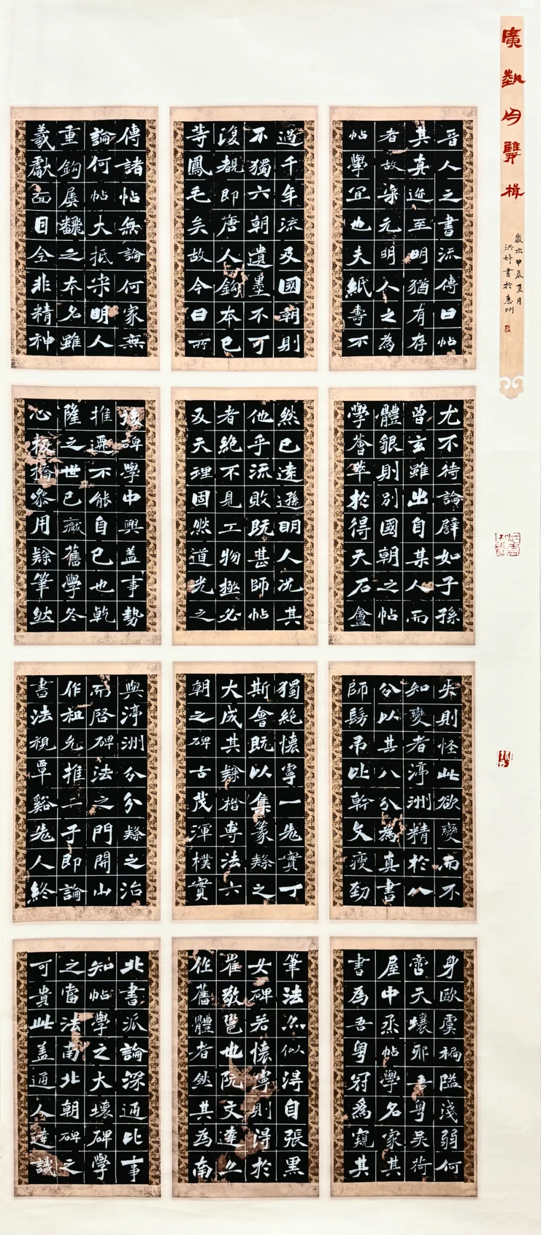 作品简析: 此作品内容选自康有为《广艺舟双辑》,书风借鉴《张猛龙碑》、《李壁墓志》,并融入自己对碑刻的理解进行创作。采用墨拓12张拼贴的形式,强调字形的变化和趣味,探究北魏碑刻创作的表现形式。