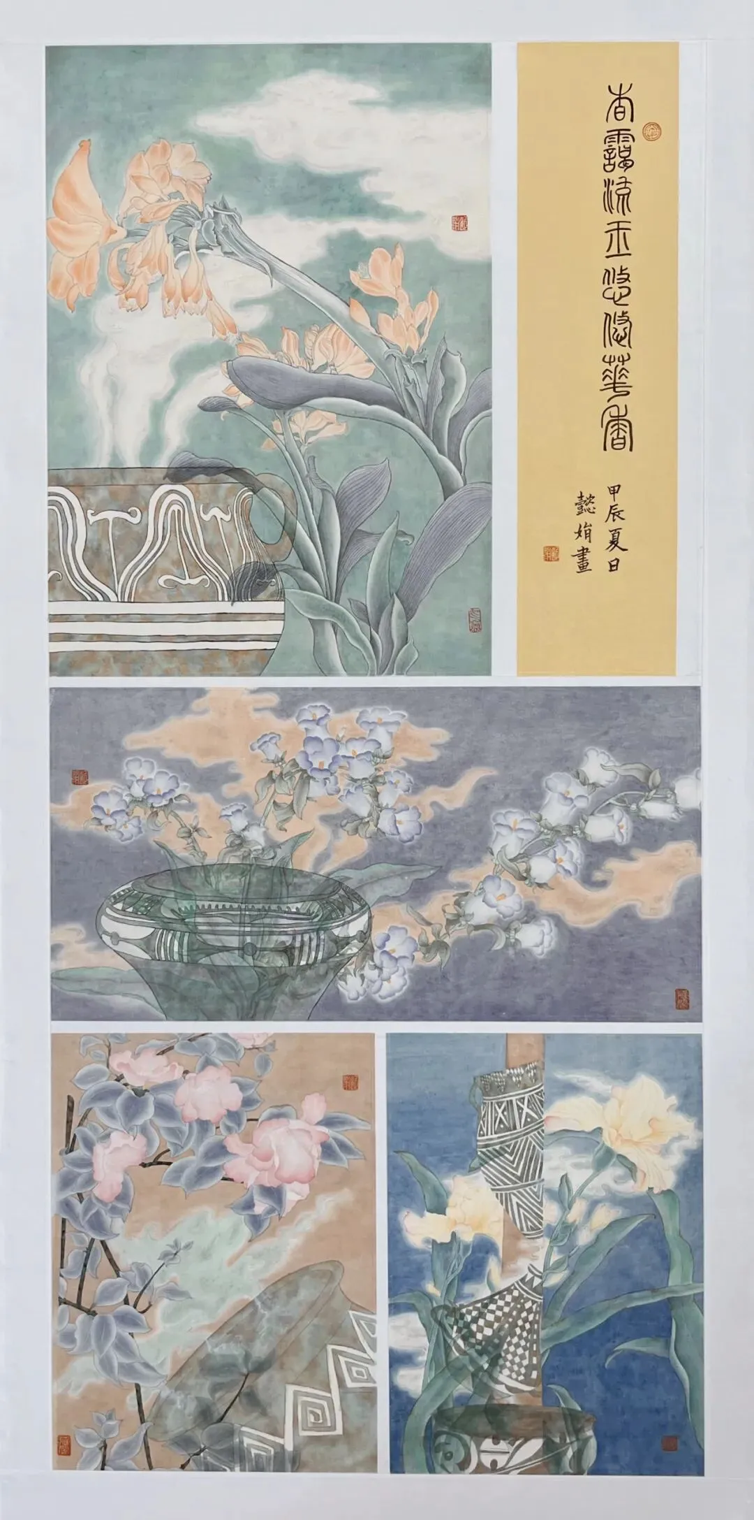作品简析:作品运用了现代花卉元素和史前时期的彩陶工艺元素来表达自然美与艺术美的交融,并添加了云雾的元素,增添了画面的朦胧感,体现出云雾缭绕,雾兴云涌画面感,仿佛是漫步在花丛中,如梦如幻,忘掉了一切烦恼和忧伤。在这里,时间仿佛静止了,倾听自己内心的声音,一切都变得那么缓慢而美好。