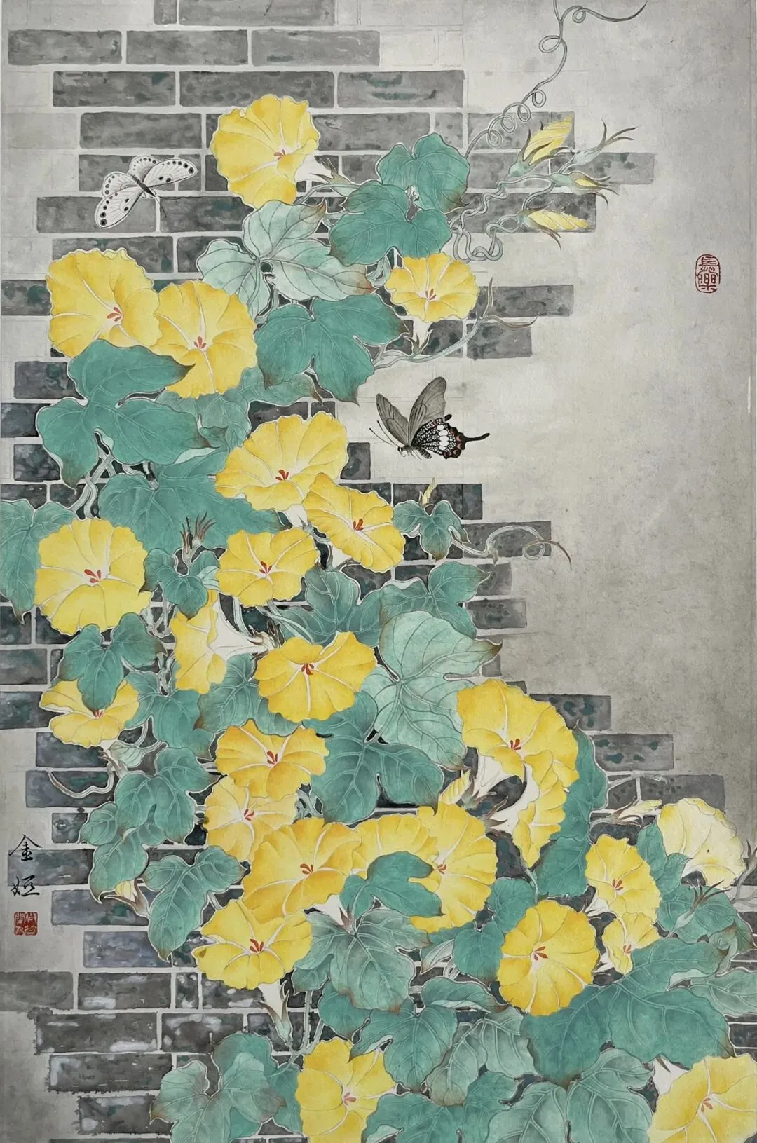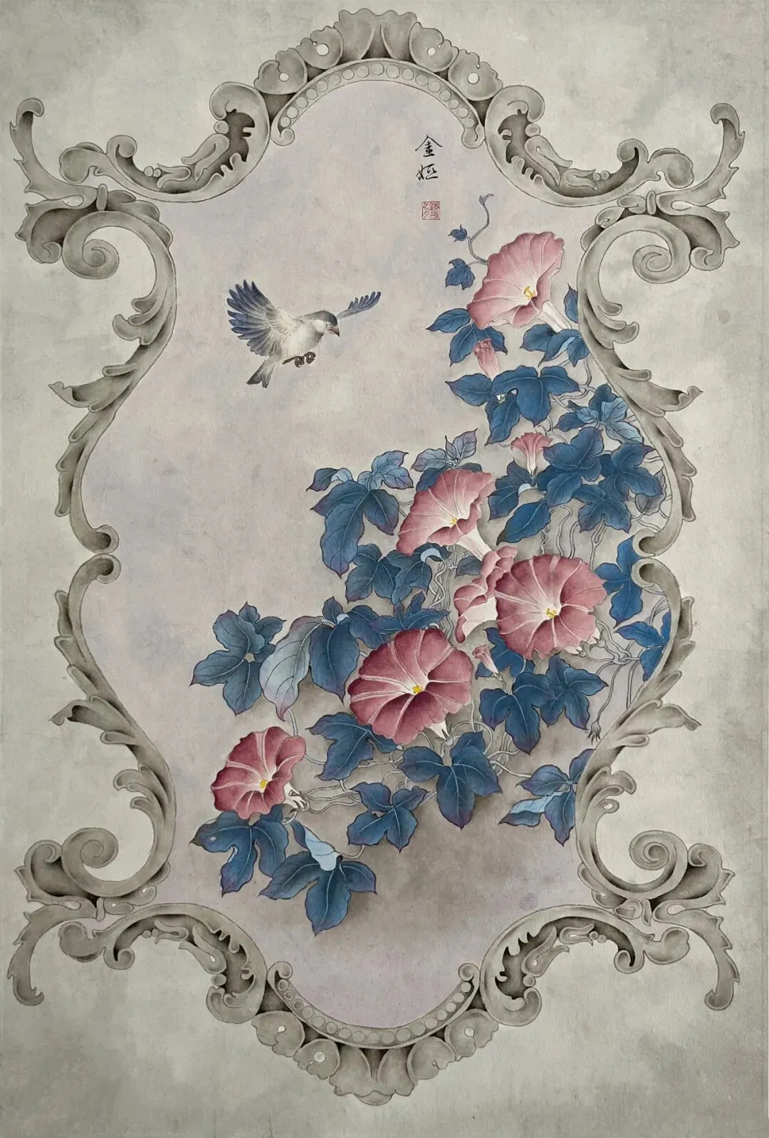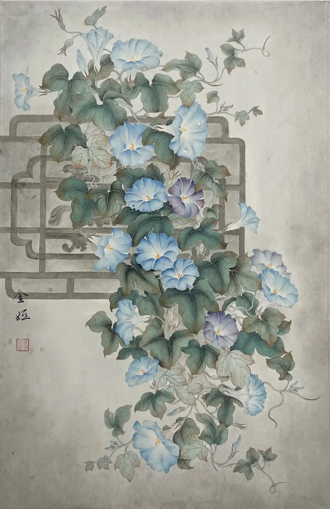 作品介绍:牵牛花出在镜中、窗外、墙角这些不起眼的地方独自生长,用工笔设色写实细腻的方式呈现系列作品——《朝颜》,旨在赞扬牵牛花的勤劳勇敢和沉着冷静的美好品质,并记录生活中美好事物的瞬间。
