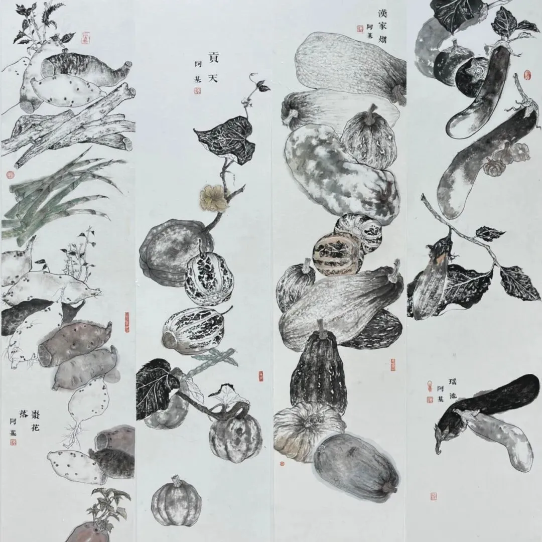 作品介绍:作品围绕“惠州特色瓜果”作为国画写意绘画题材,具有丰富的内涵和情感。它既展现了自然界的生生不息、蓬勃生长,也传递了人们对美好未来和努力奋斗的信念。在意境上,春华昭示着生命的开始和希望的到来,而秋实则象征着劳作的回报和成功的喜悦。通过蔬果绘画的形式,将这种寓意和意境生动地展现出来,品味自然的美丽和生活的真谛。