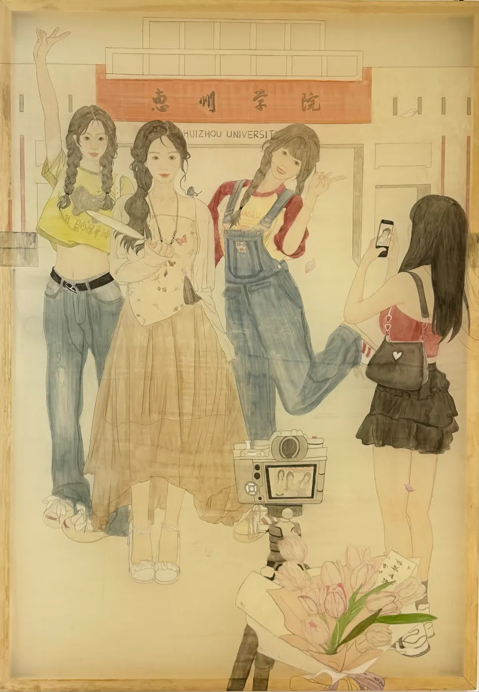 作品介绍:《我与母校合个影》记录了即将毕业的大学生与母校合影的一瞬间。作品采用了工笔画的方法,精致勾线和层层晕染,营造出温馨和谐的氛围。画中的女孩子们青春洋溢,在镜头前展示出俏丽的动作和甜蜜的笑容。一束粉色的郁金香,寄托了作者对母校的依恋与深深情感,也期望能够引起观者对母校、对教育的共鸣和思考。