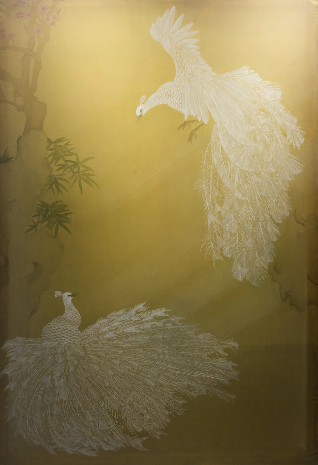 作品介绍:《凤之灵》作为一幅绢本设色的工笔画作品,通过精细的线条描绘,突出了白孔雀的轮廓和羽毛纹理。画面中两只孔雀一静一动,尽显出孔雀的尊贵娴静和轻盈无暇。孔雀的身姿与背景环境相融合,营造出宁静幽雅的氛围。创作者期望通过作品来展现大自然的生机与神奇,同时传达吉祥、幸福的美好寓意。