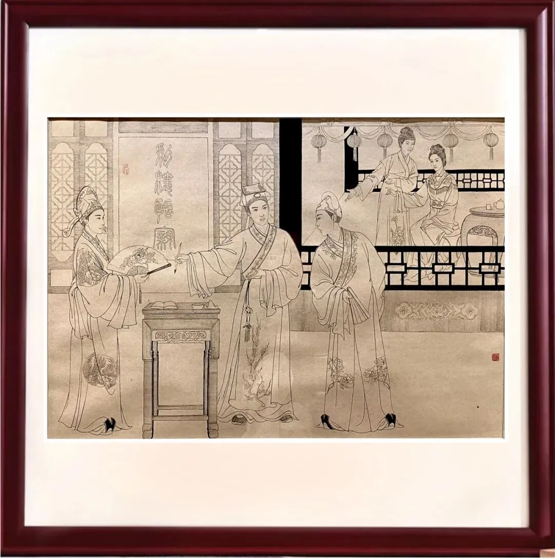 作品介绍:作品所绘“潮剧”传统剧目《彩楼记》第一场:赴彩楼 。创作剧情:宋朝宰相吕蒙正未得道时,居寒窑、食周济。退休宰相刘懋之女翠萍在彩楼抛球选婿,择其而投。刘父不允,翠萍随蒙正回窑度日。一日,吕蒙正赶斋落空,快快回窑,发现雪地上有男子足迹(翠萍母遣仆送柴米时所留),怀疑妻有不贞,借题发挥。翠萍意会真情后反而故意挑逗之,后重归于好。