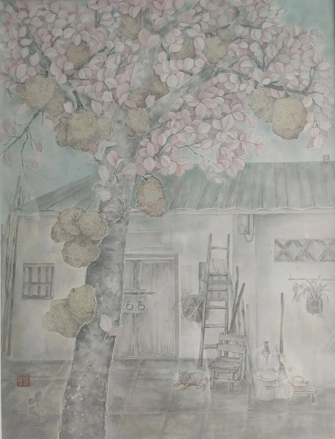 作品介绍:本文通过工笔画的表现形式来描绘乡村的自然景色,以菠萝蜜树和老房子的组合完成创作画作品,画面以黄绿色调为主,营造了一种清新、静谧、唯美的意境,表达了对自然、生命的思考和热爱。