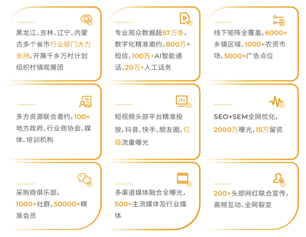 ► 动力机械:轮式拖拉机、轻型履带拖拉机、旋耕机、微耕机、汽油机、柴油机、小型挖掘机、水田打浆机、开沟起垄机等。► 种植机械:水稻直播机、水稻育秧设备、水稻插秧机、玉米播种机、油菜(蔬菜)播种机、马铃薯播种机、种子分选机、有机肥施肥机、肥料造粒机械等。► 收获机械:玉米联合收割机、马铃薯收获机、水稻收割机、稻麦油联合收割机等。► 农业配件:收割机配件、农用电动车配件、旋耕机刀片、播种机配件、打捆机配件、割草机配件、播秧机配件、施肥机配件、制草机配件、液压机配件、离合器配件、发动机配件等。► 节水灌溉:农业灌溉设备、园艺灌溉设备、精准灌溉、喷灌机械、微灌系统、滴灌管(带)及管件等节水器材、自动控制系统、太阳能灌溉系统、过滤器、水泵机组、管件、阀门、喷头、注肥泵、植保机械、园林机械、水肥一体化设施以及灌溉各类配件等。► 科技农业智能装备:农用飞机及小型无人机、农用航空施药技术与喷施装备、农用航空遥感技术、各类高效节能植保机械、智能除草机器人、空中悬挂喷灌施药机、小型智能农机具。► 温室园艺资材:温室工程、成套温室、温室材料、温室配套系统、温室骨架结构件、棚膜、植物补光、园林机械、生物组培、栽培技术及设备;土壤添加剂、穴虚、营养钵、苗木营养等。► 智慧农业高新技术:信息化农业、精准农业技术、检测仪器、无土栽培技术、农业高新技术设备、农业信息通讯服务、信息化管理、金融服务、农业物联网智能管控技术、智能滴灌系统控制器、全智能温室控制器、土壤湿度控制器、特种蔬菜、有机农业及相关技术及设备等。► 种子展区:蔬菜种子、大田种子、花卉种子、牧草种子、种子包衣剂、其他经济作物种子、种苗加工及包装。► 农药展区:杀虫剂、杀苗剂、杀蜗剂、杀鼠剂、除草剂、特异剂和植物生长调节剂等。► 肥料展区:氮肥、碘肥、钾肥、复合肥等化学肥料;海藻肥、生物肥、叶面肥、缓释肥、微量元素肥、腐殖酸肥料等新型肥料、介质土、土壤添加剂、营养剂、泥炭、竹炭等。国际化布局•链接远东市场 聚焦远东农机装备市场需求,精准邀约俄罗斯阿穆尔州、滨海边疆区等远东采购团,搭建跨境经贸对接桥梁,助力企业拓展国际市场。精准对接•保障参展实效 定向邀约北大荒各农场、地方农业合作社、种植大户及俄罗斯采购团,依托专业数据库精准匹配供需,切实保障展会对接效果。多元赋能•丰富展示形式 同期举办供需对接会、政策解读会、企业路演等丰富活动,助力企业多元化展示实力、获取行业信息、拓宽合作渠道。智能引领•汇聚行业标杆 聚行业龙头企业,集中展示智慧农业先进技术与最新成果,引领行业风向,拓展高端合作机遇。规模保障•人气持续攀升 同期举办第32届哈尔滨种业博览会暨第21届农资博览会,覆盖农业全产业链,多展联动,全方位保障现场人气与参展价值。参展商 预计将有约翰迪尔、凯斯纽荷兰、爱科集团、久保田、洋马、耐特菲姆、潍柴雷沃、中国一拖、中联农业、常州东风、江苏沃得、江苏常发、大疆、极飞、无锡卡尔曼、纬尔科技、洛阳中收、星光农机、新疆机械研究院、山东金大丰、山东巨明、河北双天、山东大华、哈尔滨沃尔科技、大禹节水、上海华维、河北润农、山东圣大、浙江托普云农、丰疆智能科技、北京合众思壮;弘宇、中兴、征和、重庆固威、大北农、垦丰、北京联创、先正达、上海惠和、青岛金妈妈、甘肃敦煌等1500+海内外优质展商到场。专业观众► 展会将邀请东三省各级农机管理、农机鉴定推广部门► 农机经销商、农机零部件经销商、维修企业► 农机大市场、农机合作社、农业合作社、农机使用大户► 农垦、农场系统;农业社会化服务组织► 科研院所、大专院校► 农机整机及零部件生产企业等到会参观权威媒体矩阵深度报道 大会将联合《农民日报》、央广网等国家级权威媒体,新浪、腾讯、今日头条等主流互联网媒体,以及北方农业机械、农机通、当代农机、农机1688网、三农网、三农在线等专业行业媒体,持续发布展会动态,单篇报道篇幅均在1000字以上,构建多维度、高规格的媒体传播矩阵,全面提升展会的行业影响力与公信力。短视频达人矩阵精准破圈 大会将邀请农业领域短视频网红、主播达人及专业讲师,围绕展会核心内容创作并推广宣发视频,预计产出视频内容超500条,通过精准的内容分发与流量运营,触达更广泛的农业从业者与终端用户,实现展会影响力的破圈传播。线下全域覆盖精准触达 大会将在全国相关行业展会投放邀请函近5万份,同时深入东三省各地农机、农资市场及核心聚集街区开展地推宣传,累计投放宣传册与门票50万份,实现对目标受众的全域覆盖,精准触达潜在专业观众,为展会引流蓄客。2026哈尔滨国际农业机械博览会联系人:吕经理手机:13804602432