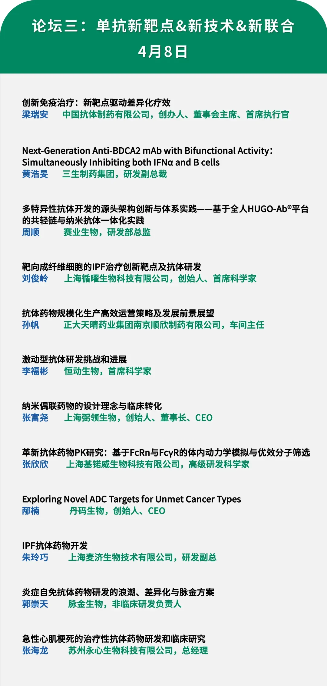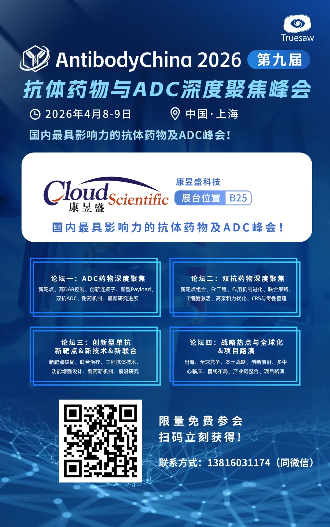 AntibodyChina 2026第九届抗体药物与ADC药物深度聚焦峰会将于2026年4月8-9日在上海盛大举行。本次峰会聚焦从下一代ADC技术革新、双抗机制进化,到TCE开发实践及全球化布局的全链条议题。峰会不仅呈现最新研发与临床进展,也剖析出海策略与产业化实践,助力国内抗体药物产业在全球舞台上实现突破与整合。