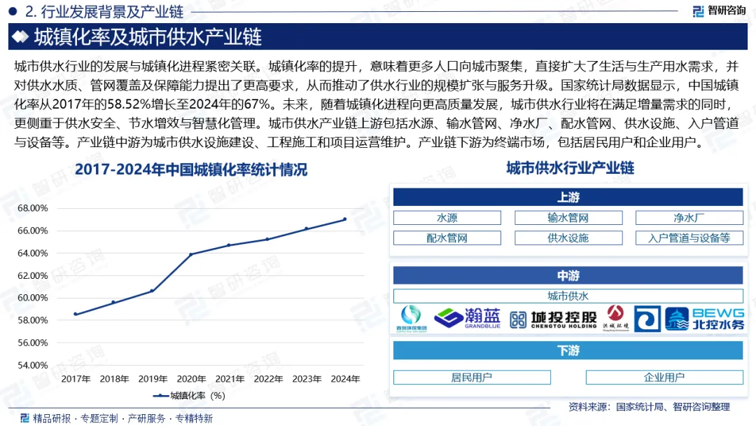 发展背景:城市供水行业的发展与城镇化进程紧密关联。城镇化率的提升,意味着更多人口向城市聚集,直接扩大了生活与生产用水需求,并对供水水质、管网覆盖及保障能力提出了更高要求,从而推动了供水行业的规模扩张与服务升级。国家统计局数据显示,中国城镇化率从2017年的58.52%增长至2024年的67%。未来,随着城镇化进程向更高质量发展,城市供水行业将在满足增量需求的同时,更侧重于供水安全、节水增效与智慧化管理。