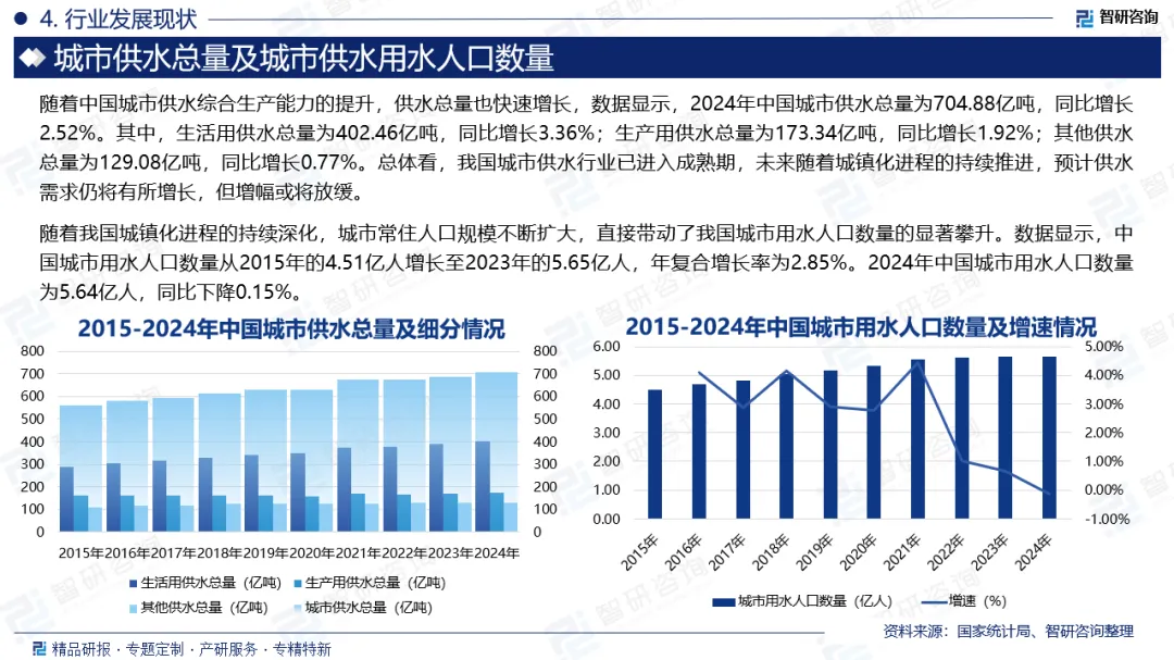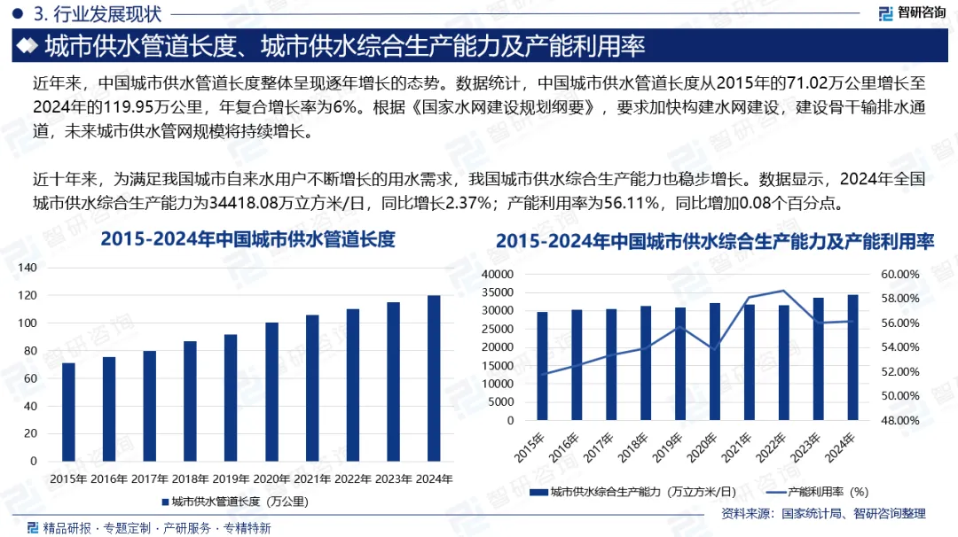 城市供水是依据建筑学规范建立的市政基础设施系统,由水源取水设施、水处理厂和输配水管网三大核心构成。该系统遵循开发水源与节约用水相结合原则,包含公共供水和自建设施供水两种形式,实施分级管理制度。近年来,中国城市供水管道长度整体呈现逐年增长的态势。数据统计,中国城市供水管道长度从2015年的71.02万公里增长至2024年的119.95万公里,年复合增长率为6%。根据《国家水网建设规划纲要》,要求加快构建水网建设,建设骨干输排水通道,未来城市供水管网规模将持续增长。近十年来,为满足我国城市自来水用户不断增长的用水需求,我国城市供水综合生产能力也稳步增长。数据显示,2024年全国城市供水综合生产能力为34418.08万立方米/日,同比增长2.37%;产能利用率为56.11%,同比增加0.08个百分点。随着中国城市供水综合生产能力的提升,供水总量也快速增长,数据显示,2024年中国城市供水总量为704.88亿吨,同比增长2.52%。其中,生活用供水总量为402.46亿吨,同比增长3.36%;生产用供水总量为173.34亿吨,同比增长1.92%;其他供水总量为129.08亿吨,同比增长0.77%。总体看,我国城市供水行业已进入成熟期,未来随着城镇化进程的持续推进,预计供水需求仍将有所增长,但增幅或将放缓。随着我国城镇化进程的持续深化,城市常住人口规模不断扩大,直接带动了我国城市用水人口数量的显著攀升。数据显示,中国城市用水人口数量从2015年的4.51亿人增长至2023年的5.65亿人,年复合增长率为2.85%。2024年中国城市用水人口数量为5.64亿人,同比下降0.15%。城市供水行业的竞争格局呈现“国有主导、民营崛起、外资渗透”的多元化特征。以北控水务、首创环保为代表的大型国有水务集团,凭借资金实力、技术积累与政策支持,在大型城市供水项目中占据主导地位。这些企业通过并购地方水务公司、承接PPP项目等方式,加速全国布局,形成规模效应。民营企业则以灵活机制与创新优势切入细分市场。例如,金科环境、碧水源等企业聚焦工业废水处理、海水淡化等高端领域,通过提供定制化解决方案赢得客户;而部分区域性民营水务公司则深耕本地市场,以高效服务与低成本运营构建竞争壁垒。外资企业则通过技术合作、股权投资等方式参与竞争,如法国威立雅、苏伊士等国际水务巨头,与中国企业合资成立项目公司,引入先进管理经验与污水处理技术,提升行业整体水平。当前,中国城市供水行业代表企业包括北控水务集团有限公司、中法水务投资有限公司、北京首创生态环保集团股份有限公司、瀚蓝环境股份有限公司、上海城投控股股份有限公司、武汉三镇实业控股股份有限公司、江西洪城环境股份有限公司、金科环境股份有限公司、北京碧水源科技股份有限公司等。