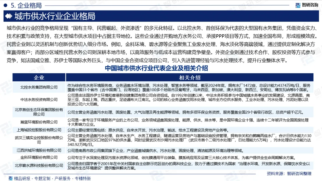 企业格局:城市供水行业的竞争格局呈现“国有主导、民营崛起、外资渗透”的多元化特征。以北控水务、首创环保为代表的大型国有水务集团,凭借资金实力、技术积累与政策支持,在大型城市供水项目中占据主导地位。这些企业通过并购地方水务公司、承接PPP项目等方式,加速全国布局,形成规模效应。民营企业则以灵活机制与创新优势切入细分市场。例如,金科环境、碧水源等企业聚焦工业废水处理、海水淡化等高端领域,通过提供定制化解决方案赢得客户;而部分区域性民营水务公司则深耕本地市场,以高效服务与低成本运营构建竞争壁垒。外资企业则通过技术合作、股权投资等方式参与竞争,如法国威立雅、苏伊士等国际水务巨头,与中国企业合资成立项目公司,引入先进管理经验与污水处理技术,提升行业整体水平。当前,中国城市供水行业代表企业包括北控水务集团有限公司、中法水务投资有限公司、北京首创生态环保集团股份有限公司、瀚蓝环境股份有限公司、上海城投控股股份有限公司、武汉三镇实业控股股份有限公司、江西洪城环境股份有限公司、金科环境股份有限公司、北京碧水源科技股份有限公司等。