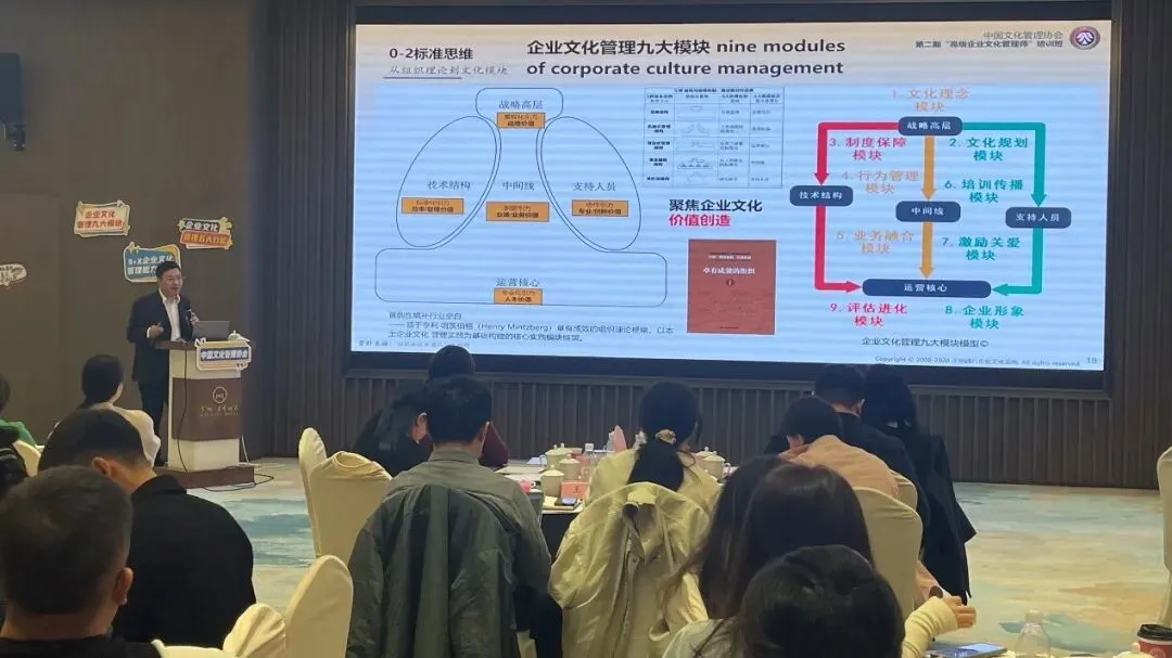 为期2天半的培训课程设计科学、内容饱满、形式多样,彻底颠覆了企业文化工作“务虚”的刻板印象。培训以“管理思维、教练思维、标准思维”三大核心思维为引领,首次系统化地提出了企业文化管理的“九大模块”框架体系,即:文化理念、文化规划、制度保障、行为管理、业务融合、培训传播、激励关爱、企业形象、评估进化。这九大模块相互关联、层层递进,构成了一个从顶层设计到落地执行,从内部共识到外部彰显的完整管理闭环。
