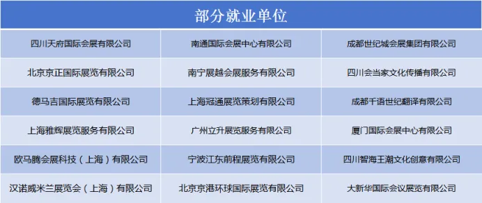 本专业学生毕业后可胜任会展策划师助理、会展执行专员、会展营销专员、展台设计师、会展接待主管、婚庆策划师等核心岗位,就职于专业会展公司、会展场馆、文化传播企业、品牌企业市场部等优质单位,也可凭借专业技能自主创业,开设会展策划公司、婚庆礼仪公司、文创会展服务机构等。