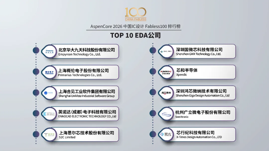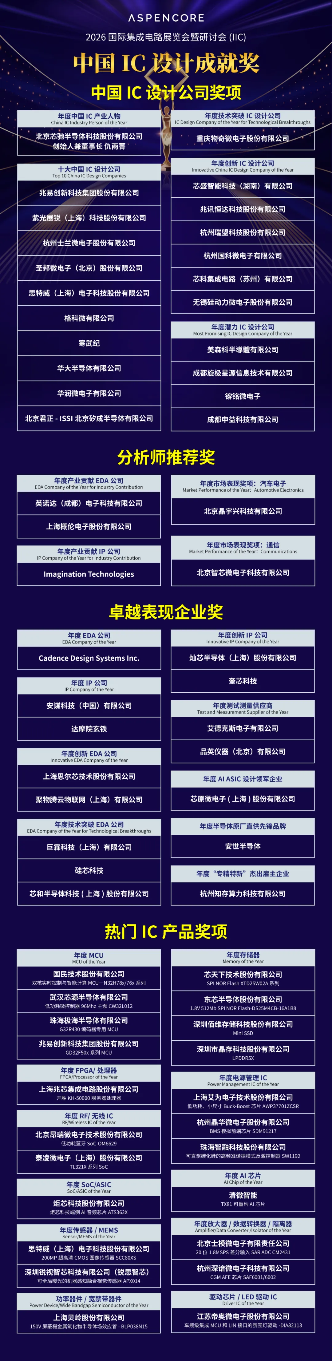 作为大会的重头戏,第24届中国IC设计成就奖颁奖典礼于3月31日晚隆重举行。这一被誉为中国电子业界标杆的奖项,旨在记录产业成长、表彰卓越力量。本届奖项评选由AspenCore社群中的电子工程师、IC设计工程师及分析师团队共同投票产生,覆盖了产业链各环节的领军企业与创新产品。十大中国IC设计公司:思特威连续第四年蝉联此殊荣,彰显其在CMOS图像传感器领域的持续领导力。北京矽成半导体(ISSI)也凭借在汽车电子等高可靠性存储市场的深厚积累成功卫冕。年度创新IC设计公司:无锡硅动力微电子凭借在绿色电源管理芯片领域的领先技术再度获此荣誉。年度技术突破EDA公司:芯和半导体因其“从芯片到系统的全栈集成系统EDA平台”在解决AI算力硬件系统性挑战方面的突破而获奖。年度产业贡献EDA公司:概伦电子连续第五年摘得该奖项,体现了业界对其推动国产EDA生态建设贡献的长期认可。年度潜力IC设计公司:镕铭微电子因其在视频处理芯片(VPU)领域创新的“视频+AI”融合架构与商业落地成果而获评。03 趋势洞见:攀峰之路,以韧为刃