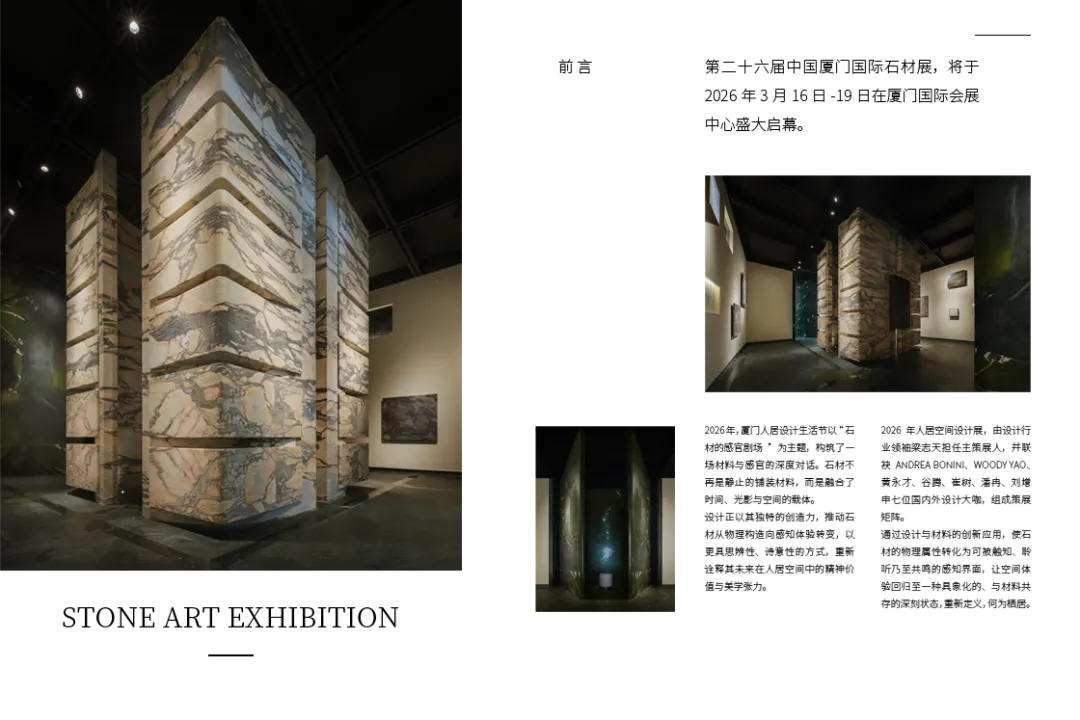 第二十六届厦门国际石材展期间,厦门人居设计生活节以“石材的感官剧场”为主题,特邀七位国内外设计师于3月16日至19日呈现人居空间设计展。通过设计与材料的创新应用,将石材的物理属性转化为可触可感的共鸣界面,让空间体验回归与材料共存的深刻状态,重新定义栖居。
