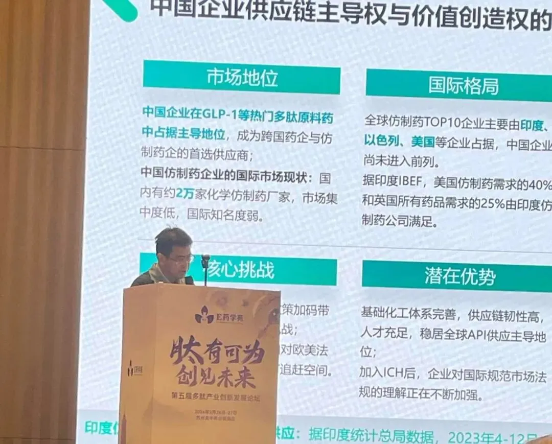 健元医药副总裁,研发带头人李新宇先生在会议现场发表了主题演讲——《GLP-1药物发展趋势及原料药需求》。从GLP-1赛道发展趋势、原料药需求变化和行业共性挑战三个方面分析,针对高难度分子合成、产能放大与合规壁垒等核心挑战,健元医药依托覆盖多肽合成、制剂及分析的全技术平台,提供从临床前到商业化的端到端一体化服务,助力新药研发更稳、更短、更高效。