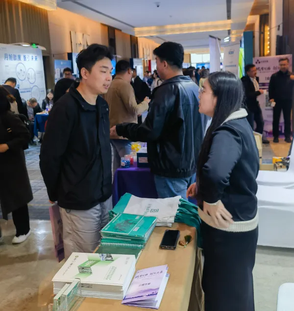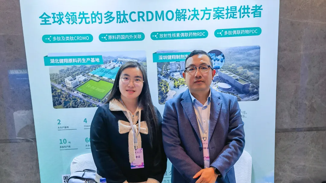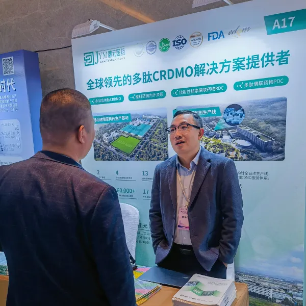 论坛现场A17展位上,健元医药的销售团队给客户耐心讲解我司在规模化生产、灵活定制合成以及国际合规等方面的优势。作为深耕多肽领域17年的全球多肽解决方案服务商,健元医药具备全产业链CRDMO服务能力,能够为客户提供从药物发现到商业化生产的一站式多肽解决方案。