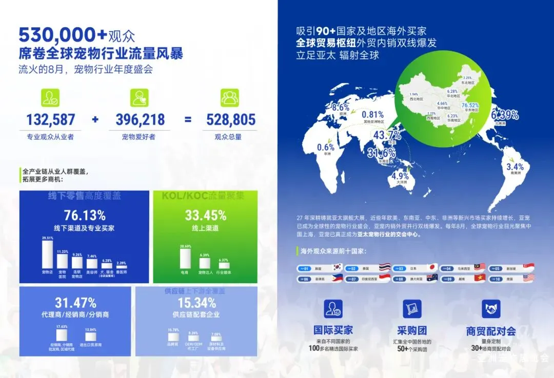 亚宠深耕行业27载,不断定义宠物行业发展新坐标,以强劲的创新力驱动产业升级,链接全球资源,缔造无数合作机遇,铸就亚太宠物旗舰大展地位。本届展会将吸引90+国家及地区海外买家立足亚太,辐射全球,成为亚太宠物行业的资源交汇中心与合作桥梁。
