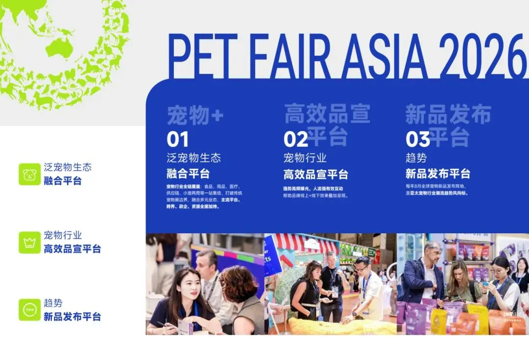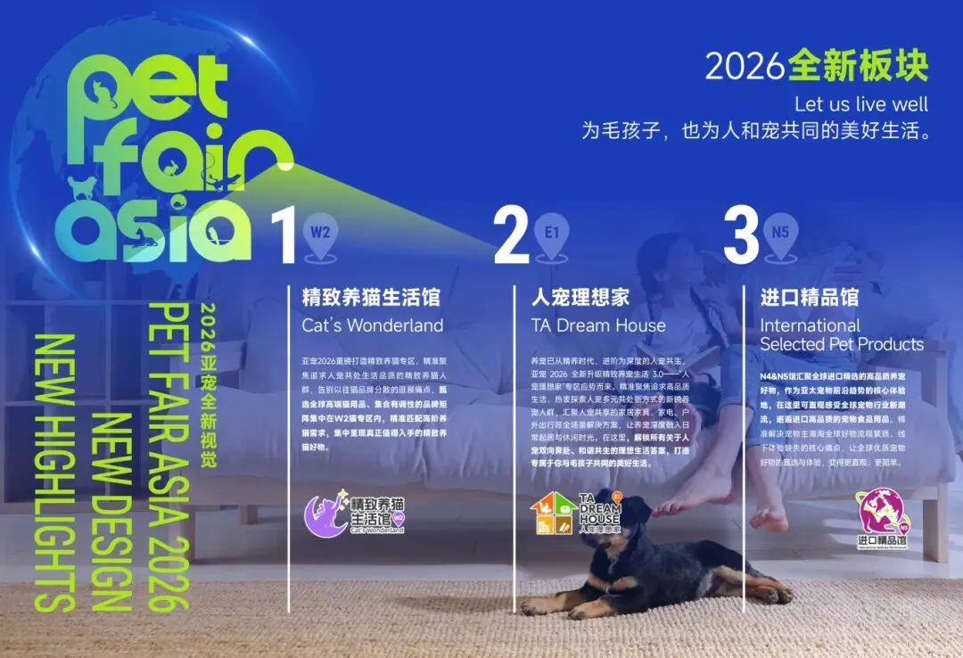 2026亚洲宠物展以全新视觉形象重磅亮相,以“为毛孩子,也为人和宠共同的美好生活"的核心理念,立足新高度打造“精致养猫生活馆”、“人宠理想家”、“进口精品馆”三大核心展区,为品牌搭建专业高效的贸易展示平台,为业内观众打开链接国内外市场的新视野,更为宠物爱好者带来创意升级的宠物友好新体验。
