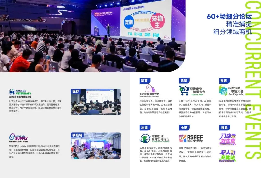 展会全面覆盖宠物全产业链,食品、用品、医疗、供应链、小宠两爬等一站集结,打破传统宠物展边界,深度融合多元业态。每年8月引领亚太宠物行业潮流趋势,主流平台、跨界品牌、政企单位等全面加持,全方位构建泛宠物生态超级平台。整合线上线下全域资源,叠加高频品牌曝光与强人流互动优势,成为业内强势品宣阵地。