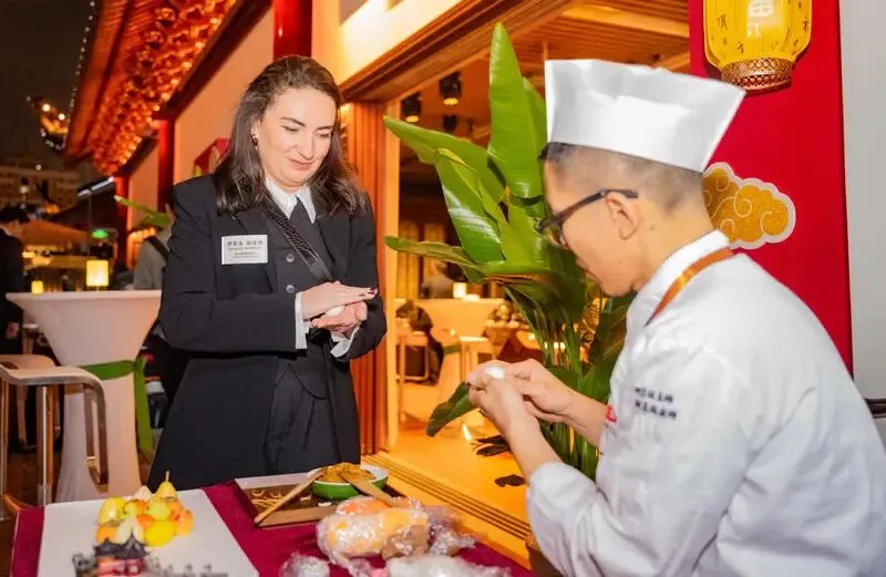 在豫园商城的海上梨园,嘉宾们沉浸于一场中国传统艺术的盛宴,昆曲的婉转悠扬与民乐的清越动听交织成韵,尽显东方文化之美。与此同时,现场还精心安排了老字号匠心技艺的体验环节:绿波廊的点心大师现场展示海派点心制作绝技,指尖翻飞间,一件件造型精巧、风味独特的点心跃然眼前;丽云阁的扇面画师则挥毫泼墨,为嘉宾们量身定制个性扇面,每一笔都蕴含着传统艺术的精髓;湖心亭的茶艺师亦不甘示弱,邀请嘉宾们共品香茗,体验茶艺的雅致与深邃。