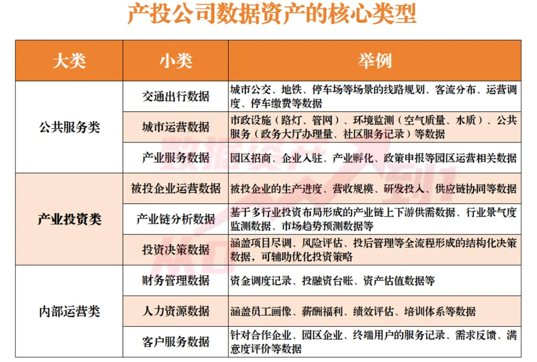 产投公司作为地方产业投资与运营主体,其数据资产主要源于公共服务授权、产业投资场景积累及运营管理沉淀,结合业务属性可分为三大类:一是由政府授权产投公司运营管理的公共服务类数据资产,也是产投公司最核心的优质数据资产,具有垄断性、高频性、稳定性特征。二是产投公司在产业投资、股权管理过程中积累的围绕被投企业、产业链的相关数据,具有专业化、场景化特征。三是产投公司在自身经营管理过程中形成的支撑企业高效运转的数据。