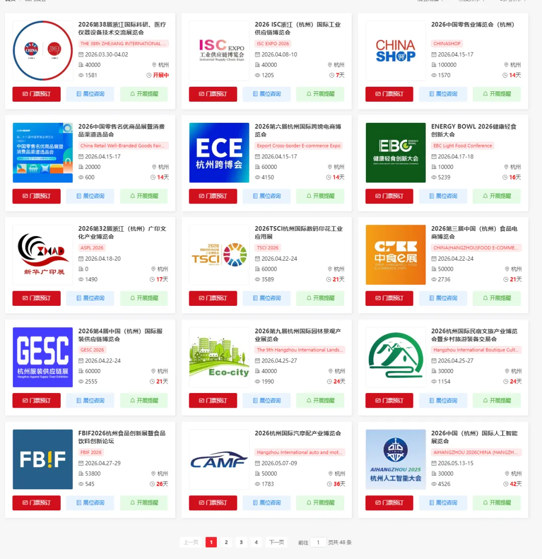 4月杭州将举办多场重要的展会活动,涵盖了美容、家博会、婚博会、跨境电商、户外、私域团购、化妆品、美容、储能、孕婴童、家具、国内电商、玩具、健康、医疗器械、工业、健康、零售、食品、广告、印花、服装、园林、民宿、光电激光、食品、汽车配件展展等多个领域。小编为大家整理了4月杭州展会排期表,希望能帮助你规划行程。末文获取杭州展会门票预约入口~(大多展会限时免费预约)