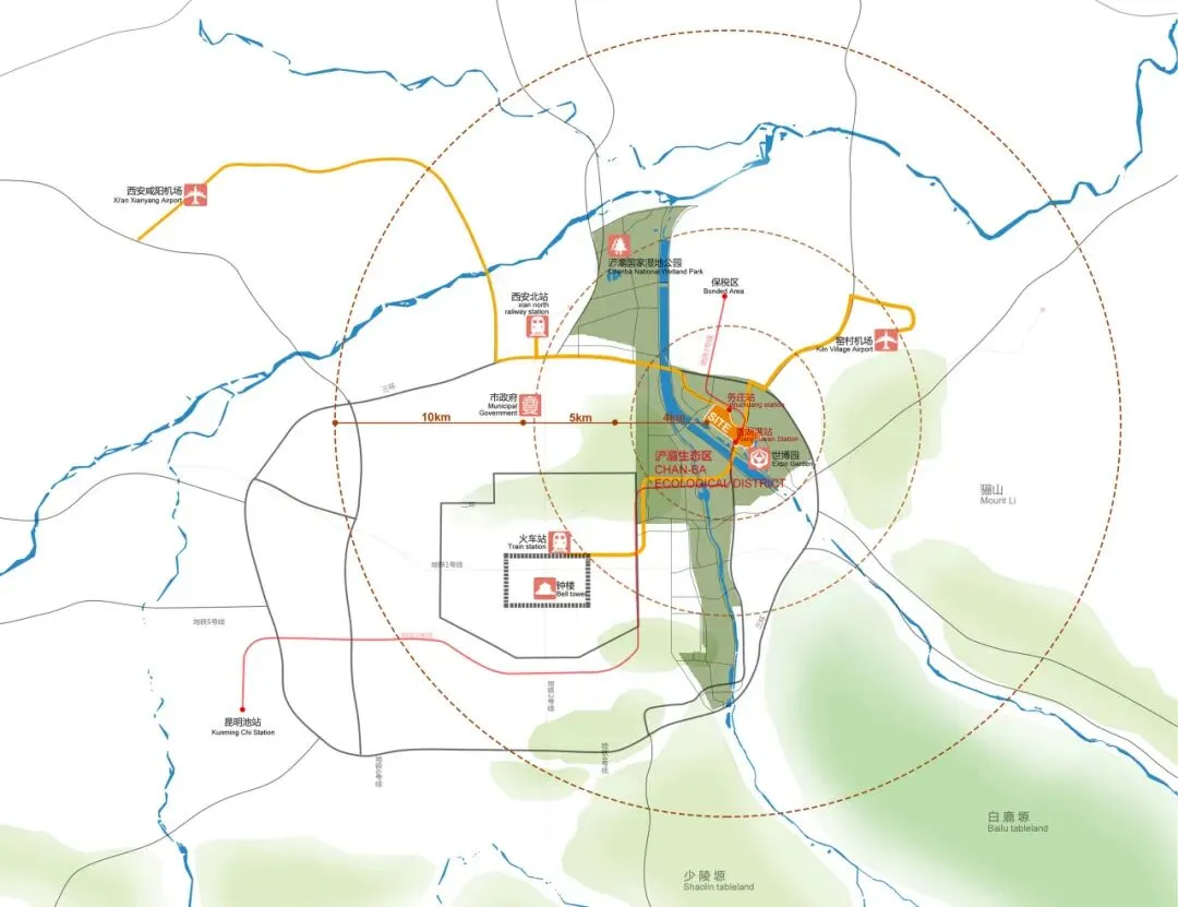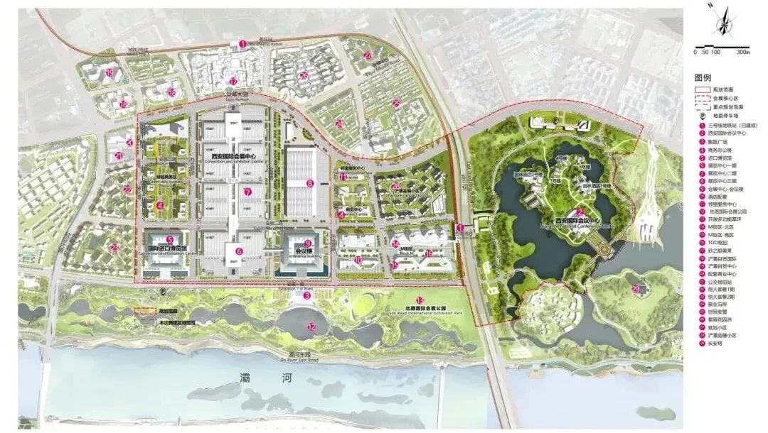 规划以国际会展中心为核心驱动和战略性节点,以极佳的生态环境、便捷的对外交通、前瞻性的基础设施为框架,发展绿色会展、绿色产业、绿色生活,形成人、展、城一体,居、业、游共进的区域格局,以面向未来的视野打造引领大西安的东部新城中心、未来会展典范。