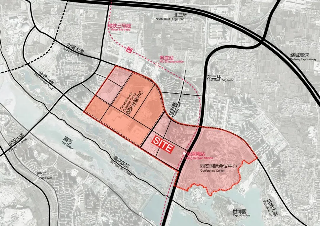 西安丝路国际会展中心片区位于西安市浐灞生态区灞河东岸,东三环两侧。东至世园公园,西至锦堤四路(现西会展路),南至香槐一路(现会展一路),北至世博大道,总规划面积298公顷。(图2)