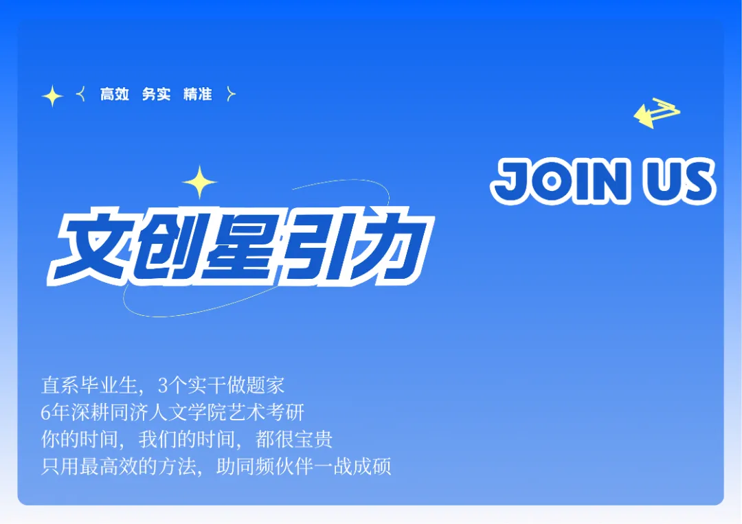 同济的“产教融合”,不只是一句教学理念,更是一套从命题到备考再到应试的完整方法论。掌握它,你不只是在备考,而是在用产业视角+学术视角重新理解文化创意设计与策展。这是高分选手的底层优势,也是和90%普通考生拉开差距的关键一步。