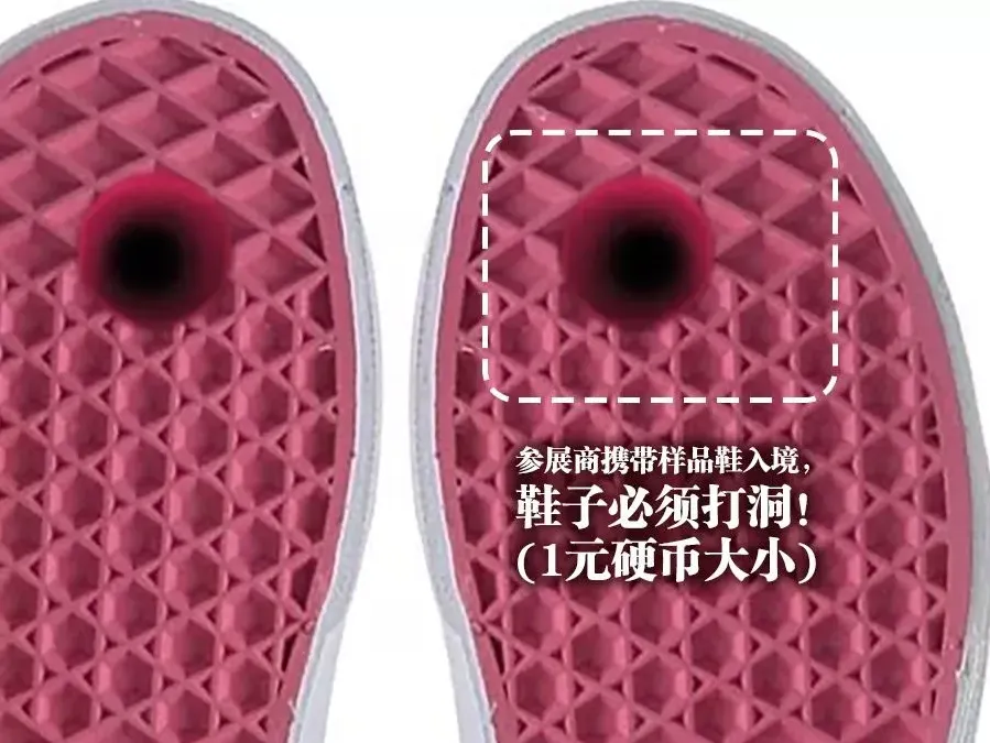 所有的鞋样须为打孔的单只鞋,打孔必须打穿,孔洞约为 1元硬币大小。