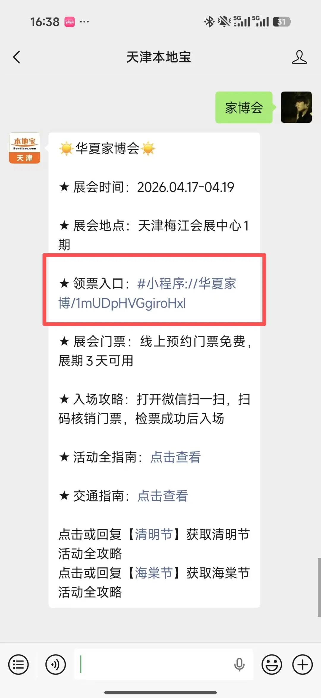 华夏家博小程序或长按下方二维码,关注【天津本地宝】公众号,微信对话框回复【家博会】即可获取免费领票入口