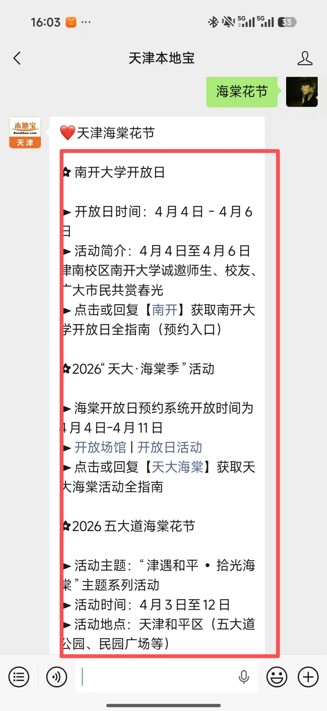 微信对话框回复【海棠花节】