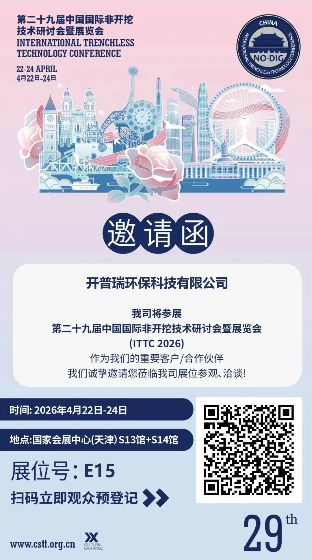 各位广大的客户朋友们,第二十九届中国国际非开挖技术研讨会暨展览会(ITTC2026)将于4月22日-24日在天津国家会展中心举办。我们诚邀您共赴这场行业盛宴!