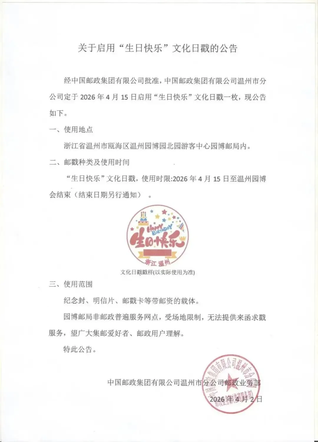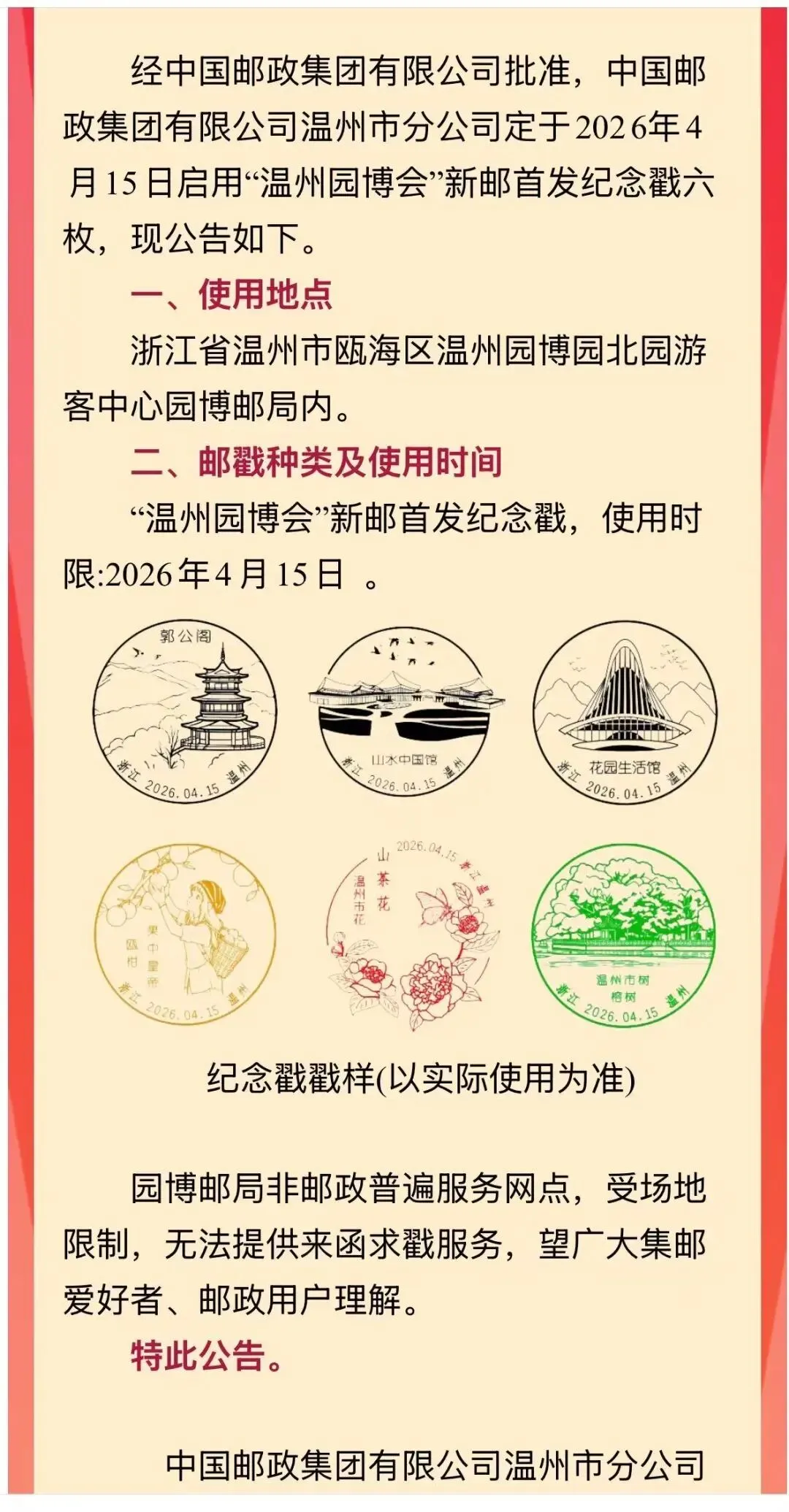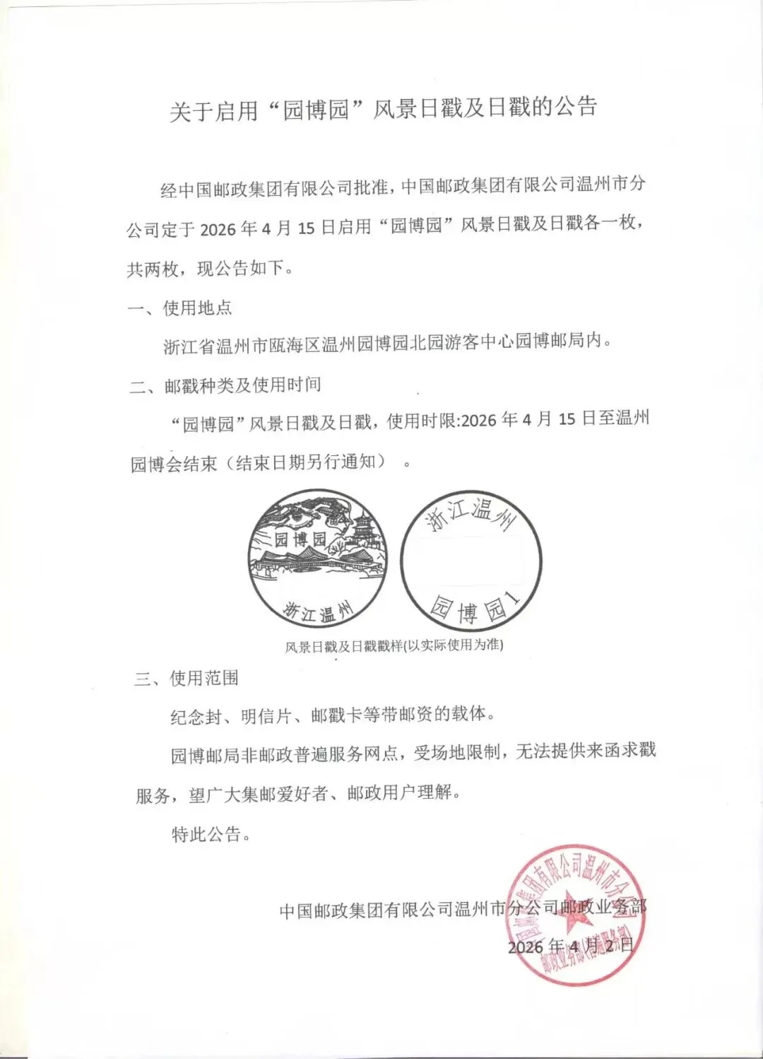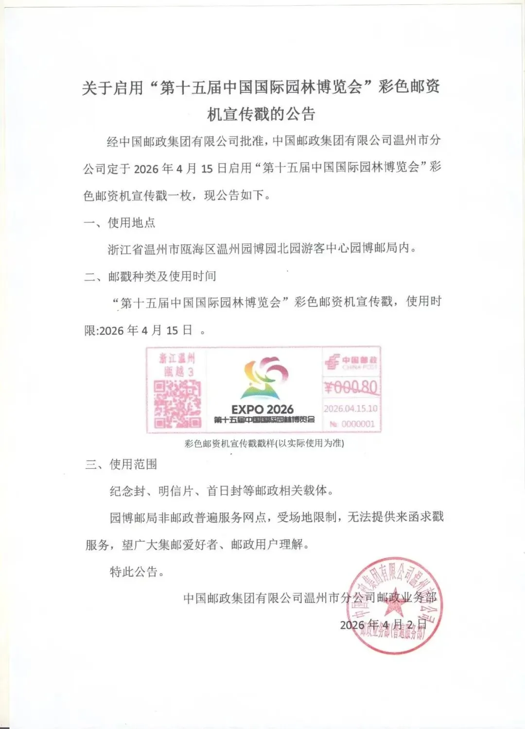 配合邮票发行,第十五届中国国际园林博览会邮资机戳、日戳、临时日戳4月15日启用