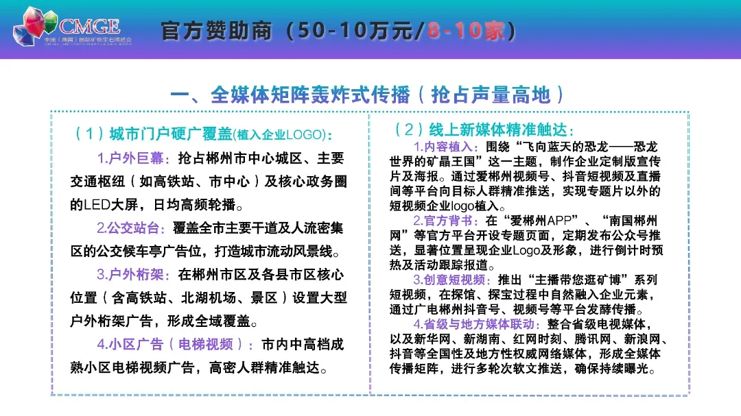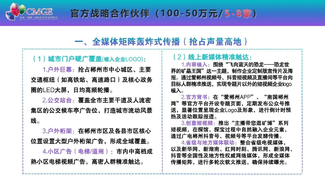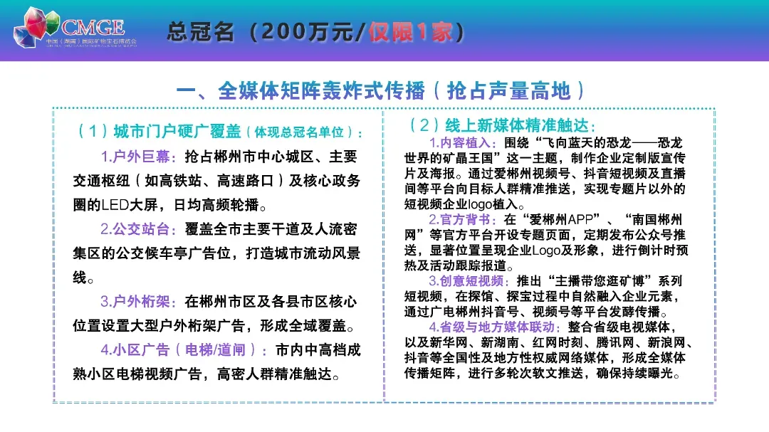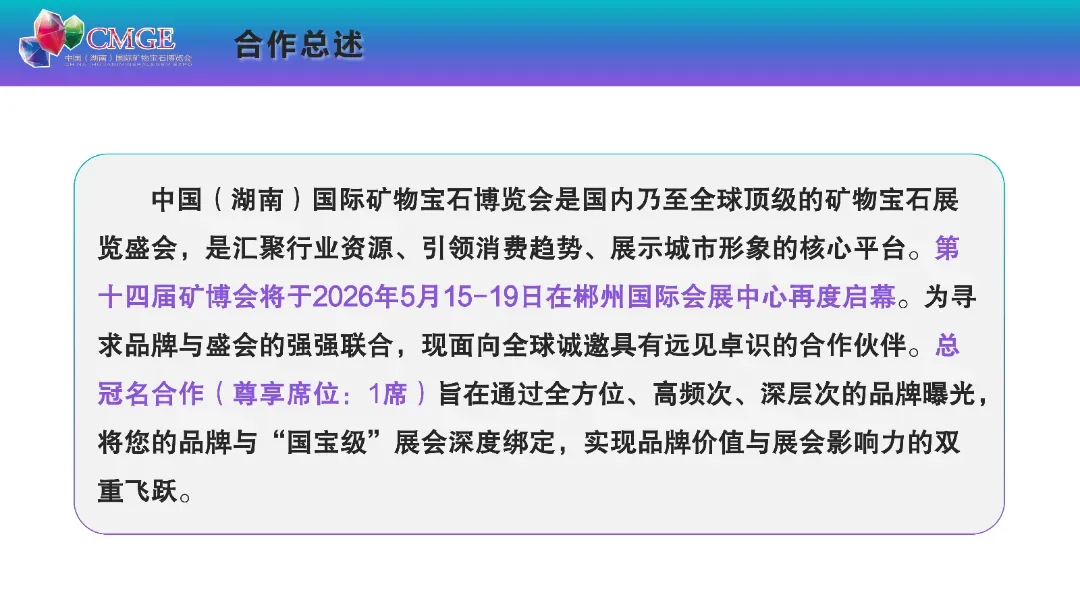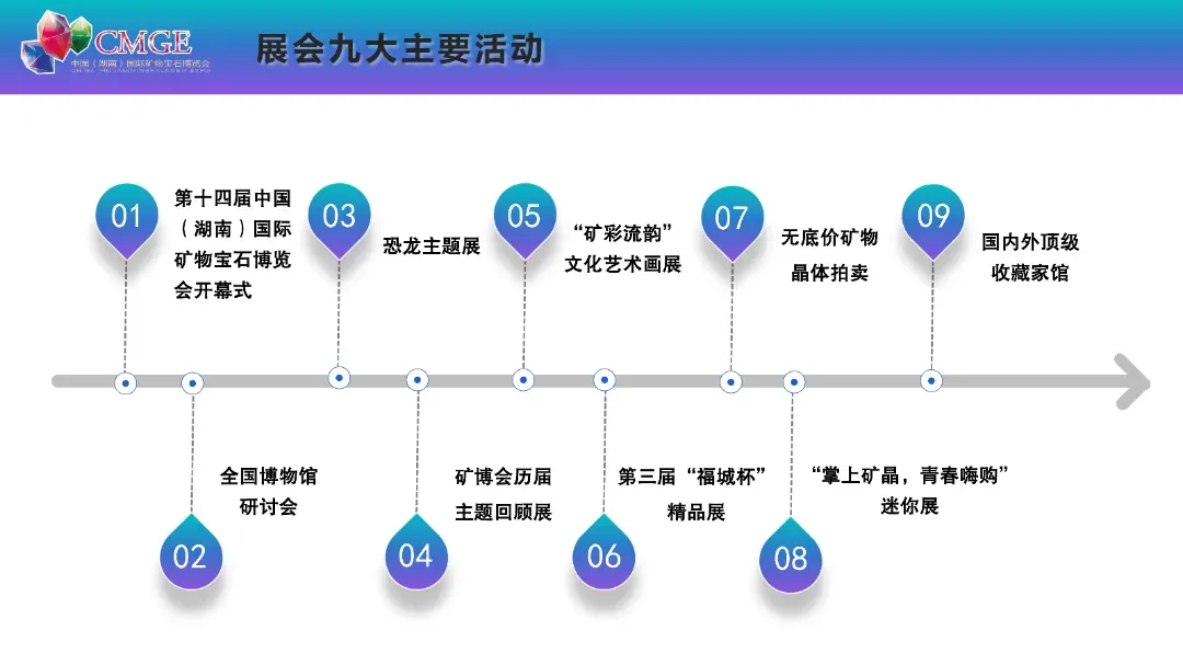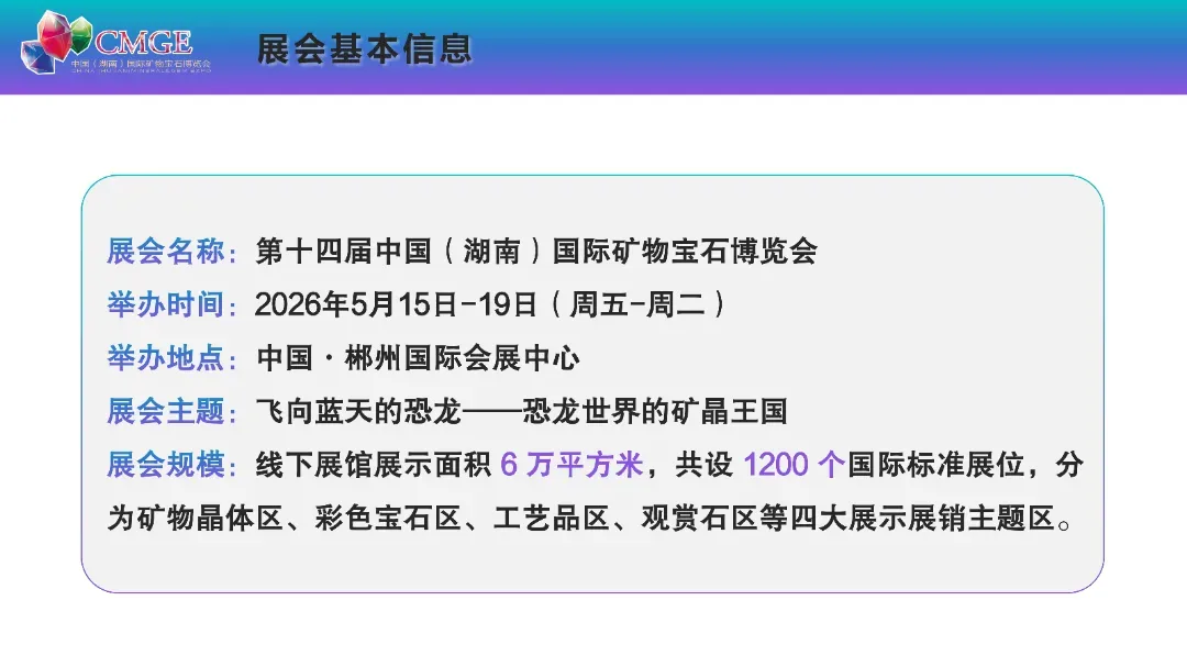 本届矿博会以“飞向蓝天的恐龙 —— 恐龙世界的矿晶王国” 为主题,打造 6 万平方米线下展馆、1200 个国际标准展位,划分矿物晶体、彩色宝石、工艺品、观赏石四大主题展区,更有九大特色主题活动轮番上演,沉浸式解锁矿物宝石的魅力,汇聚全球行业资源,打造顶级矿物宝石行业盛会。