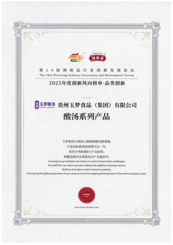 三月蓉城,春糖飘香;江城武汉,食材荟萃。在刚刚过去的3月,玉梦集团先后亮相第112届全国糖酒商品交易会(成都春季糖酒会)与2026武汉良之隆中国食材电商节,以双展告捷的优异成绩,向全国乃至全球展示了贵州酸汤的独特魅力与强劲实力。作为中国食品行业的“风向标”,成都春季糖酒会汇聚了来自全球的客商与美食爱好者。玉梦集团展位前人头攒动,浓郁的酸香引得过往客商纷纷驻足品鉴。从经典的瓶装酸汤到创新的定制化酸汤火锅底料,从便捷的家庭装酸汤粉面到主打健康的酸汤饮料,玉梦集团此次参展的八大系列120余款产品全面展示了企业深耕酸汤产业27年的深厚积淀。令人惊喜的是,在本届糖酒会期间,玉梦集团凭借卓越的产品研发能力,荣膺“第14届调味品行业创新发展论坛·2025年度创新风向榜单——品类创新”荣誉。 组委会在颁奖词中指出:玉梦集团分离核心菌种破解发酵难题,不添加防腐剂即可使保质期长达一年,依托专利构建八大产品矩阵,将酸汤推向全球,驱动全产业链跃升。这一权威奖项的获得,充分彰显了行业对玉梦集团在酸汤品类创新与标准化引领方面的高度认可。紧随其后,在有着食材供应链第一展之称的武汉良之隆中国食材电商节上,玉梦集团再次成为焦点。面对餐饮连锁化、标准化的市场趋势,企业重点推介了其智能化生产的定制化酸汤底料,吸引了大量连锁餐饮品牌及供应链企业的关注洽谈。两场展会期间,玉梦集团不仅巩固了与老客户的合作关系,更与新伙伴达成了多项合作意向,为2026年的市场拓展奠定了坚实基础。良之隆・2026第十四届中国食材电商节玉梦集团展台展会上的火爆人气,源自企业强大的硬实力支撑。就在今年2月,玉梦集团总部大楼落成暨五万吨酸汤产能扩建项目正式建成投产。这一总投资8000多万元的重点工程,使企业产能从7万吨一举跃升至12万吨,标志着玉梦集团在标准化、规模化、智能化生产上迈上了新台阶。作为贵州生态食品领域代表产业,酸汤产业对于乡村振兴的作用也不可忽视。玉梦集团产能的跃升不仅保障了市场供应,更通过“公司+基地+农户”模式,辐射带动辣椒、西红柿等原材料种植面积约10万亩,联结农户超6万户,为乡村振兴注入了强劲动力。在此次双展中,玉梦集团的国际化布局同样引人注目。2025年海南自由贸易港封关运作后,玉梦集团迅速布局,在海南定安成立海南酸汤科技开发有限公司,打造面向东南亚的桥头堡。3月29日,海南定安生产基地一厂区正式投产,标志着玉梦集团“琼黔联动”双引擎发展战略全面启航。“选择海南,就是选择未来。”集团董事长田其明表示,依托海南自贸港的政策红利,玉梦集团将实现“贵州酸汤”与“海南糟粕醋”双轮驱动,让中国发酵美食共同走向世界舞台。目前,玉梦集团销售网络已覆盖全国31个省区市,产品出口至东南亚、欧美、澳大利亚等30多个国家和地区。从“土坛子”走向“可复制”,从作坊式生产迈向标准化、品牌化,玉梦集团始终将科技创新作为发展的核心驱动力。此次荣获“品类创新”奖项,正是对企业在发酵技术领域突破的最佳注脚——通过分离核心菌种破解酸解发酵难题,在无防腐剂添加的前提下实现长达一年的保质期。玉梦集团每年超千万元的研发投入,以及与贵州大学、四川大学等高校建立的深度科研合作,使得企业已累计获取知识产权60余项,并主导或参与40余项行业标准的制定。在智能化改造方面,玉梦集团新投用的全自动化生产线从原料炒制到成品包装实现高度自动化运行,生产效率大幅提升,仅麻江明洋生产基地的4条袋装自动化生产线,单日产能就达10万包。科技赋能正让这碗传承千年的苗家酸汤焕发新生。展望未来,酸香飘向世界2025年,黔东南州凯里酸汤全产业链总产值达81.54亿元,同比增长221%。作为行业龙头企业,玉梦集团2025年实现综合产值5.34亿元,2026年目标直指6.5亿元。此次成都、武汉双展的圆满成功,不仅为企业新一年的高速增长开了个好头,更向行业展示了酸汤产业的巨大潜力。“以前总说有华人的地方就有老干妈,现在我们要做到有华人的地方也要有酸汤。”玉梦集团副总经理杨政州的话语铿锵有力。从贵州深山走向全国餐桌,从中国味道迈向世界舞台,玉梦集团正以双展告捷为新的起点,引领酸汤产业驶入高质量发展的快车道,让千年酸汤美食香飘世界!来源:玉梦食品