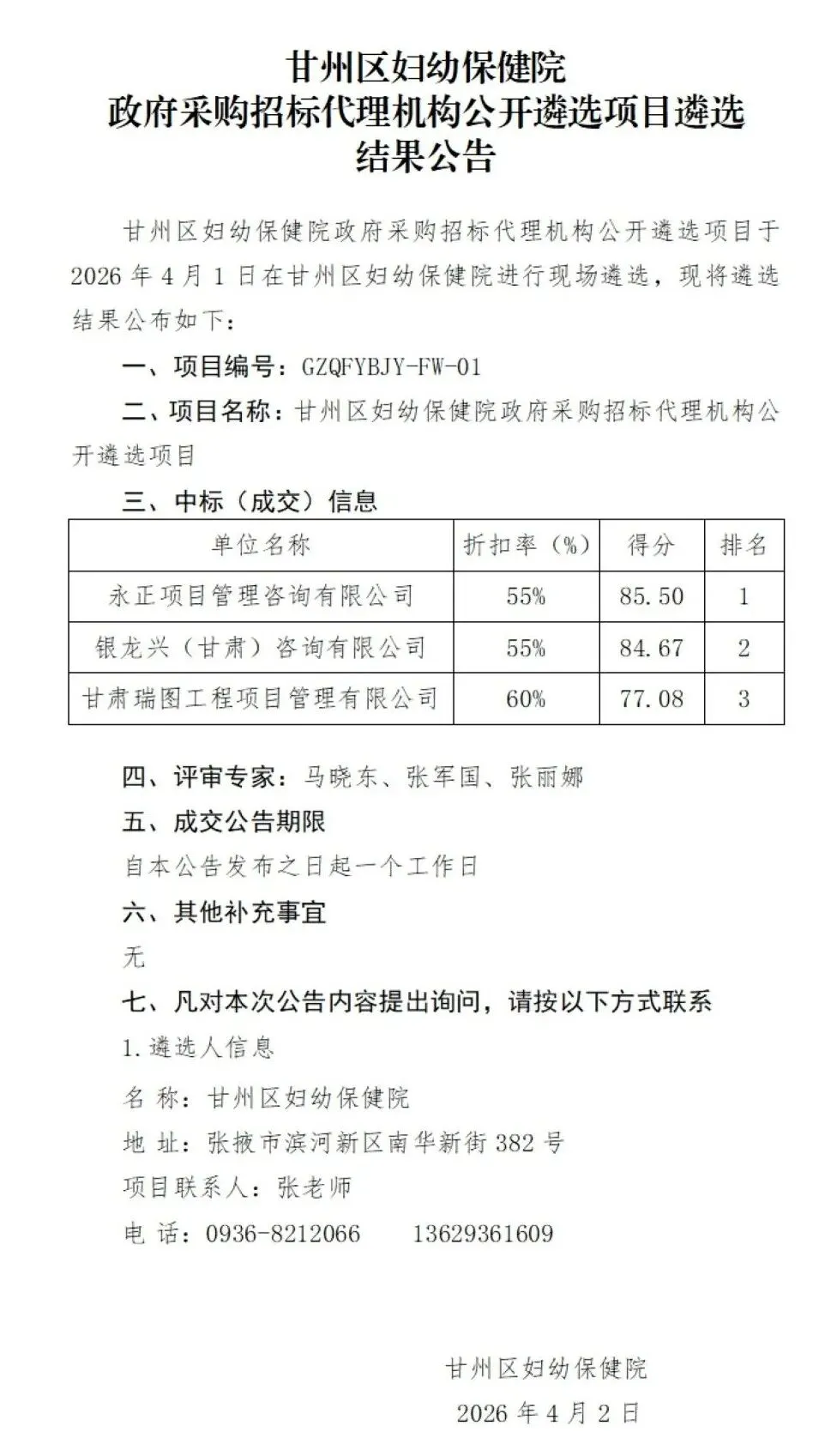 重要通知 | 甘州区妇幼保健院政府采购招标代理机构公开遴选项目遴选结果公告