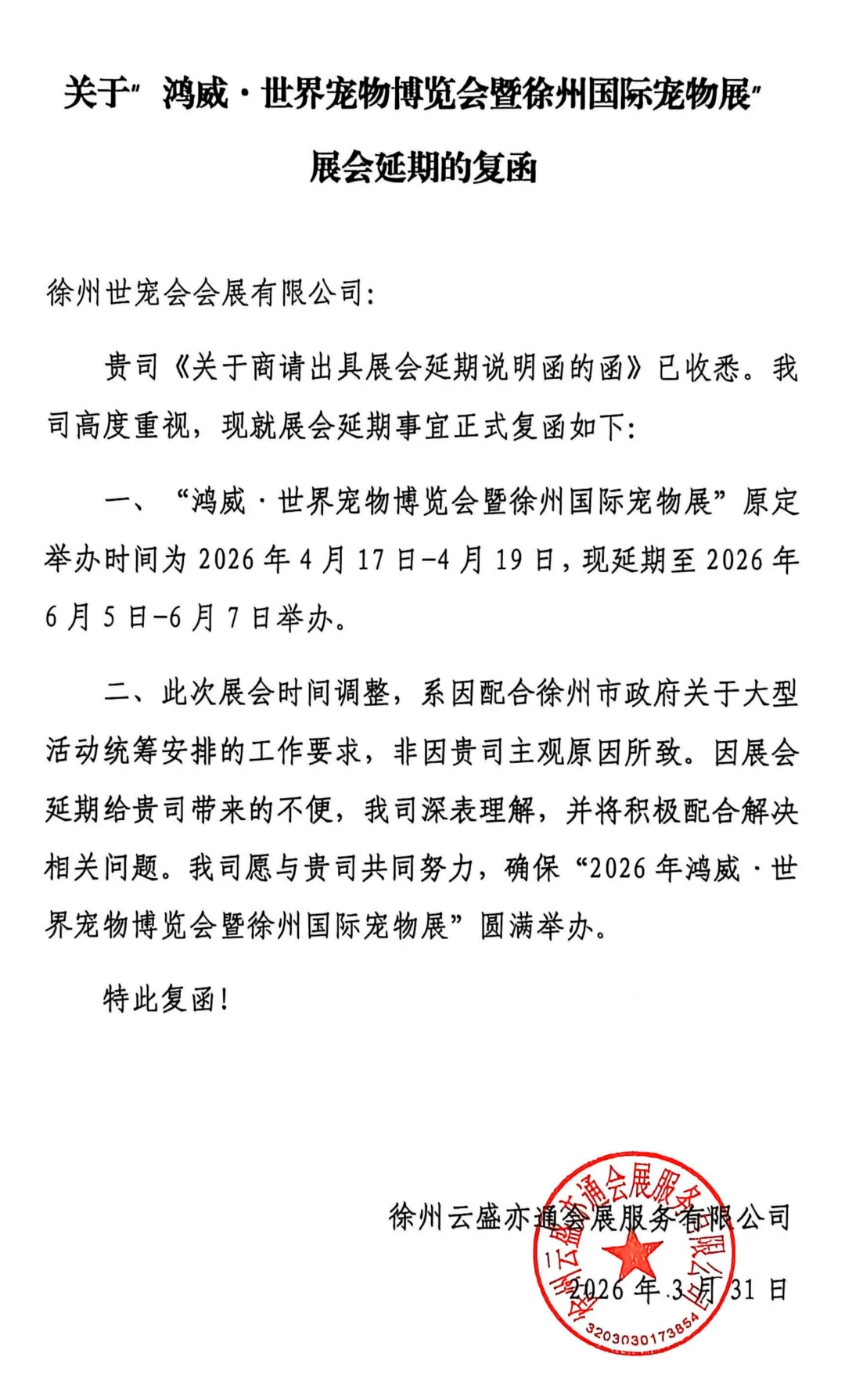 您好!首先,衷心感谢您一直以来对世宠会徐州展的支持。为确保展会举办效果、保障所有参与人员的出行便捷与活动体验,经主办方慎重研究并与相关部门沟通确认,现就世宠会徐州展举办时间调整事宜,正式通知如下:
