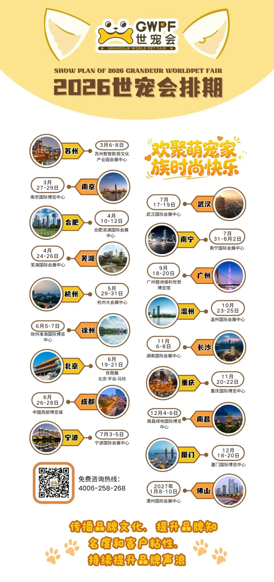 原定于2026年4月17日-19日举办的世宠会徐州展,因举办日期与当地重要赛事撞期,且赛事期间展馆周边将实施交通管制,车辆及人员通行将受到严重影响,无法保障展会正常有序开展。为避免给大家带来不便,主办方决定将本次展会延期至2026年6月5日-7日举办,展会举办地点保持不变(徐州淮海国际博览中心,紧邻奥体中心)。