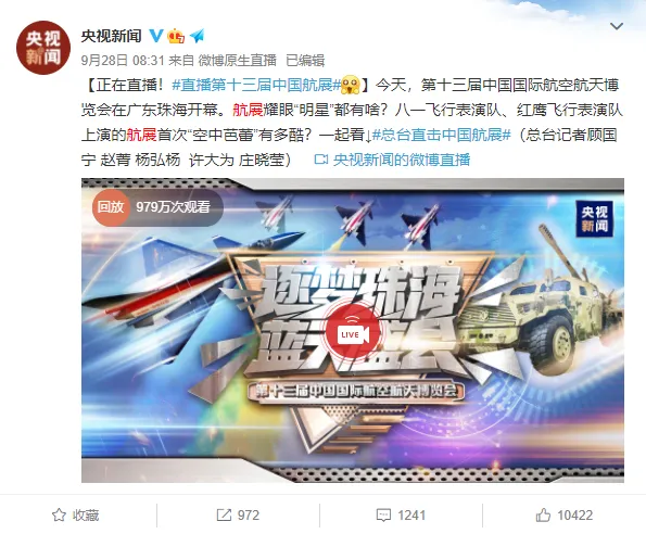 二是权威媒体报道、矩阵式联动传播,引起全民热议。航展六天,央视《新闻联播》五次播发航展消息,央视新闻频道、经济频道、军事频道联合直播时长大屏近30小时、小屏时长超过100小时,广东电视台四台联播近30小时;央视新闻、广东广播电视台、观海融媒(珠海传媒集团)等媒体对航展进行全程直播,新浪微博、微信直播、今日头条、腾讯新闻、快手、抖音、B站等多家媒体平台进行转播,累计超过4.5亿人次在线观看,航展专题阅读量超95亿。
