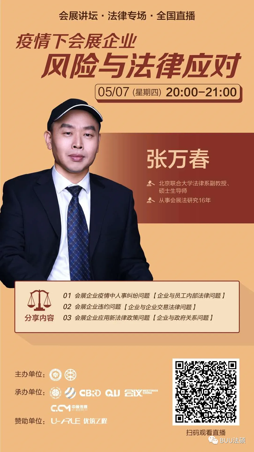 张万春,北京联合大学法律系副教授,硕士生导师,从事会展法研究16年,有着丰富的相关经验,应会展讲坛邀请于5月7日晚20.00做客直播间,带来疫情下会展企业风险与法律应对主题分享,主要分享了01 会展企业疫情中人事纠纷问题【企业与员工内部法律问题】;02 会展企业违约问题【企业与企业交易法律问题】和03 会展企业应用新法律政策问题【企业与政府关系问题】。为疫情期间会展企业的各类风险提供了法律上的有效解决方法,收获了热烈的赞赏。
