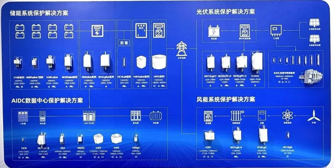 此外,还有多款储能专用熔断器产品同步亮相,全面覆盖储能 PACK、高压盒、PCS、直流汇流柜等核心环节保护需求,适配1500V-2000V高压储能系统,全系产品均符合 GB 44240等权威标准,兼具高可靠性与强适配性,全方位满足不同客户的产品需求。