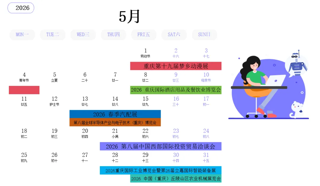 为支持相关单位、企业精准对接招商资源,办好“家门口的招商”,会展商务产业发展办公室梳理了《2026年4-5月国博中心会展机会清单》。各单位、企业可结合工作和业务实际,借机借势开展招商引资和各类促消费活动。