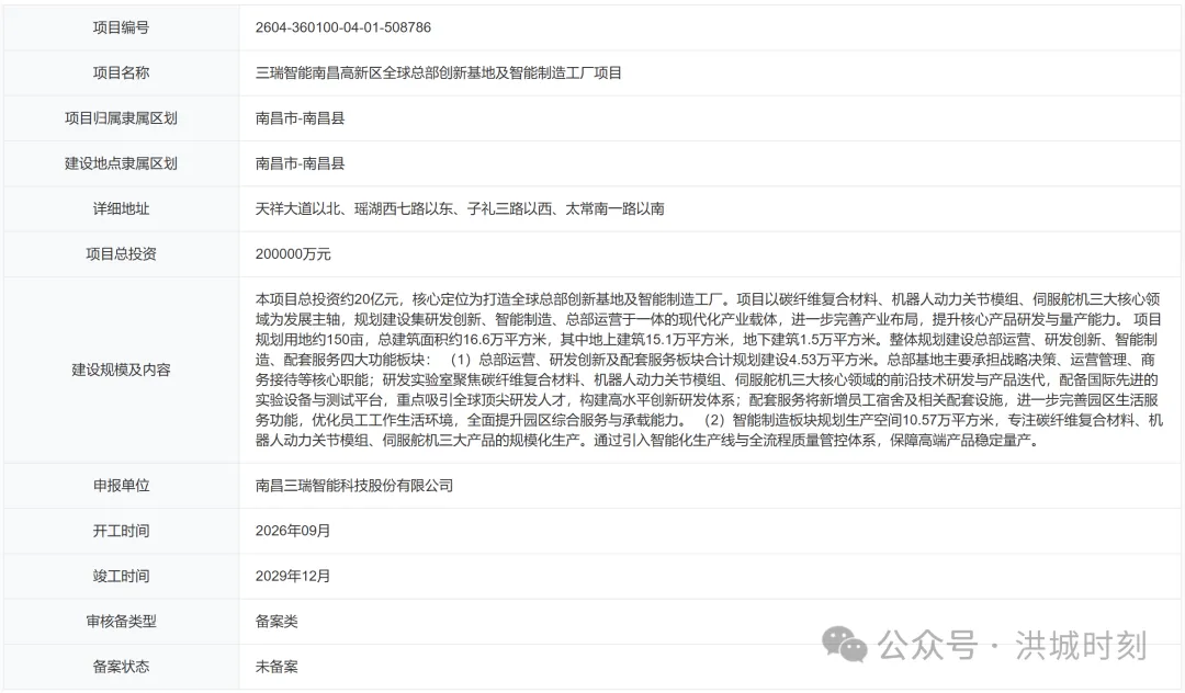 近日,江西省投资项目在线审批监管平台公示了三瑞智能南昌高新区全球总部创新基地及智能制造工厂项目备案信息,项目编号2604-360100-04-01-508786。