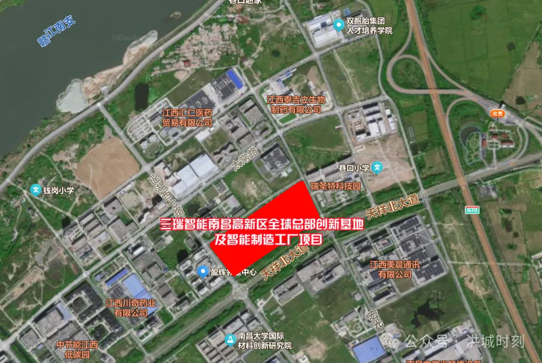 从区位看,该项目详细地址位于天祥大道以北、瑶湖西七路以东、子礼三路以西、太常南一路以南,项目申报单位为南昌三瑞智能科技股份有限公司,项目预计开工时间2026年9月,竣工时间2029年12月。