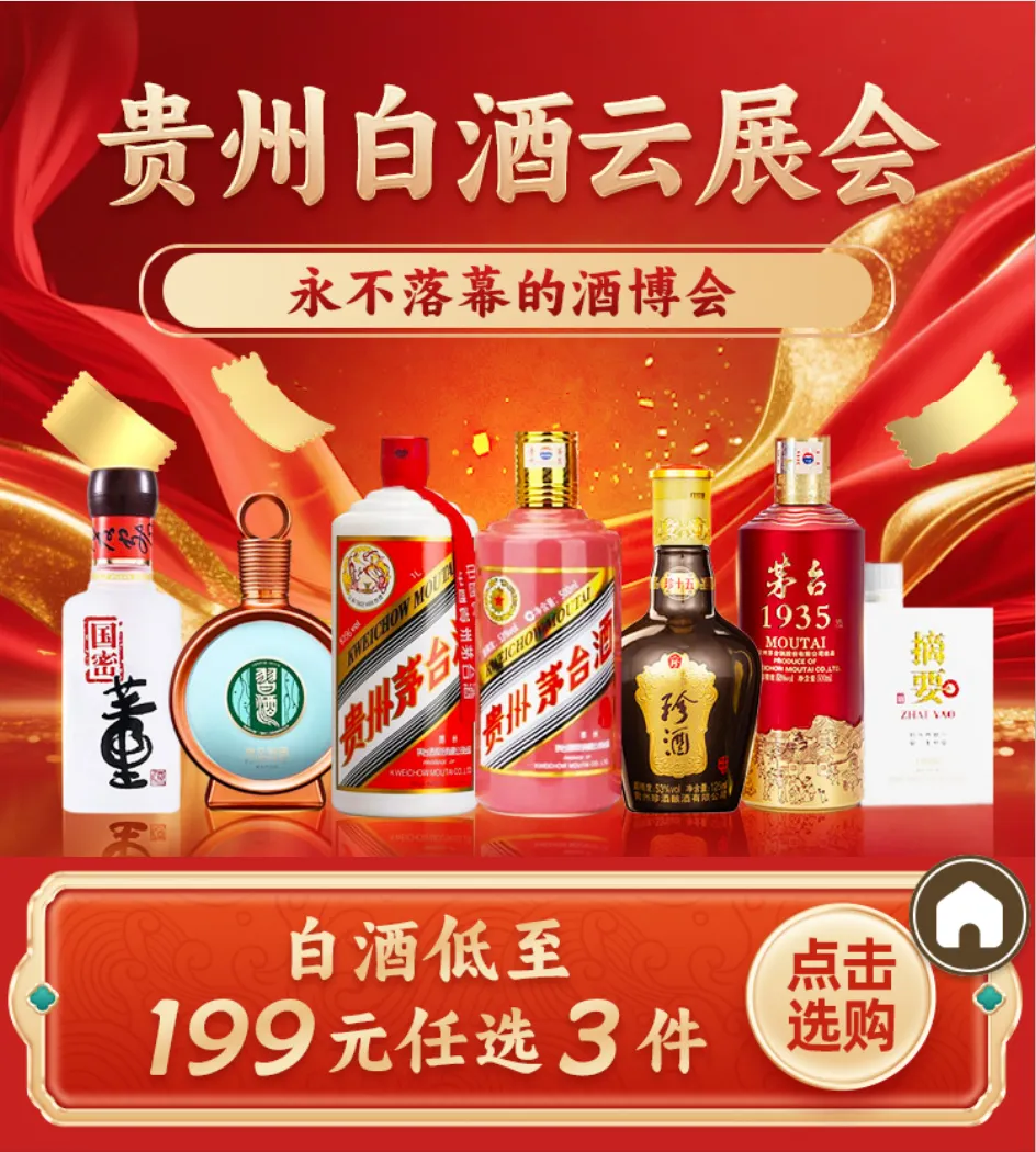 贵州白酒云展会,七个板块,数百款佳酿。从几十元的口粮到数千元的典藏,从八大名酒到新晋热门款,从单瓶购买到“n元n件”组合优惠——你需要的贵州白酒,这里几乎都能找到。