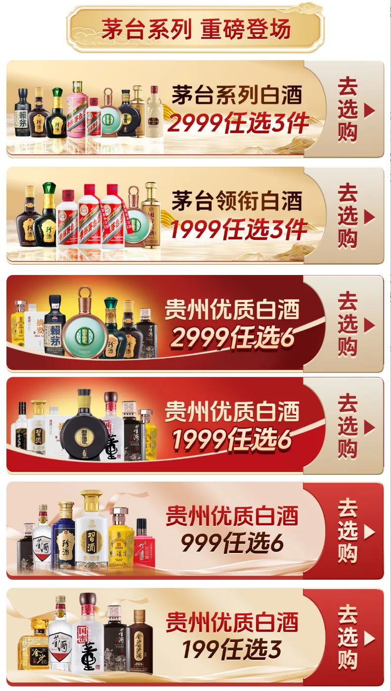 这是云展会上首当其冲的省钱区。199元任选3件,折算下来每瓶不到70元,日常小酌、朋友聚会囤货毫无压力。还有“茅台系列白酒任选”、“茅台领衔白酒任选”以及“贵州优质白酒2999/1999/999任选6件”等多种组合。想一次体验多款贵州风味?想用一份预算把酒柜填满?n元n件专区就是你的首选。