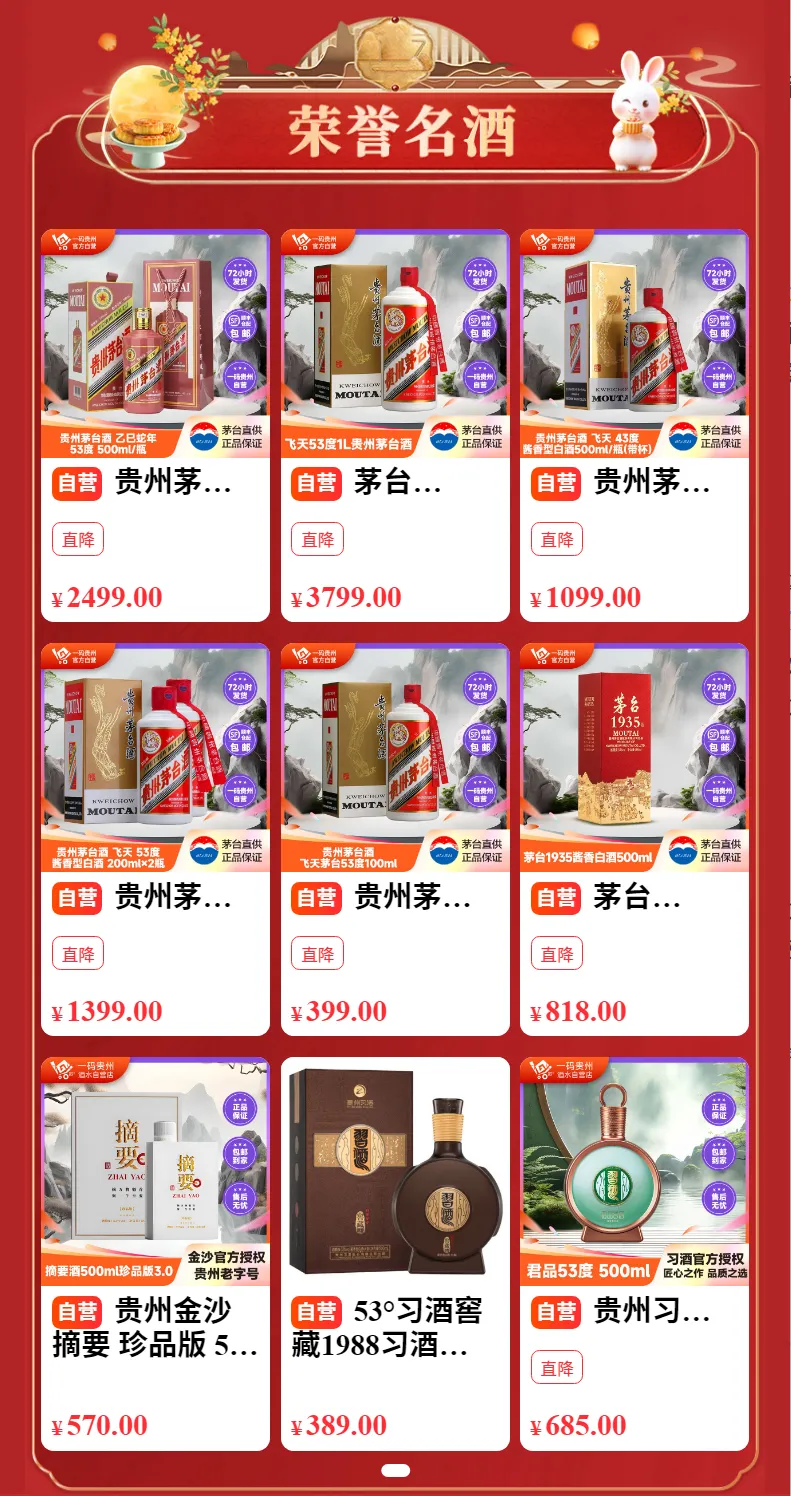 这个板块汇集了在行业评选中屡获认可、口碑扎实的明星产品。蛇年茅台、飞天、茅台1935、金沙摘要、习酒窖藏1988、君品习酒悉数在列。它们或是在国际烈酒大赛中摘得奖项,或是常年位列消费者复购榜单前列。无论是招待重要客人,还是为家里添一瓶“硬通货”,荣誉名酒板块都能让你选得放心、喝得有面。